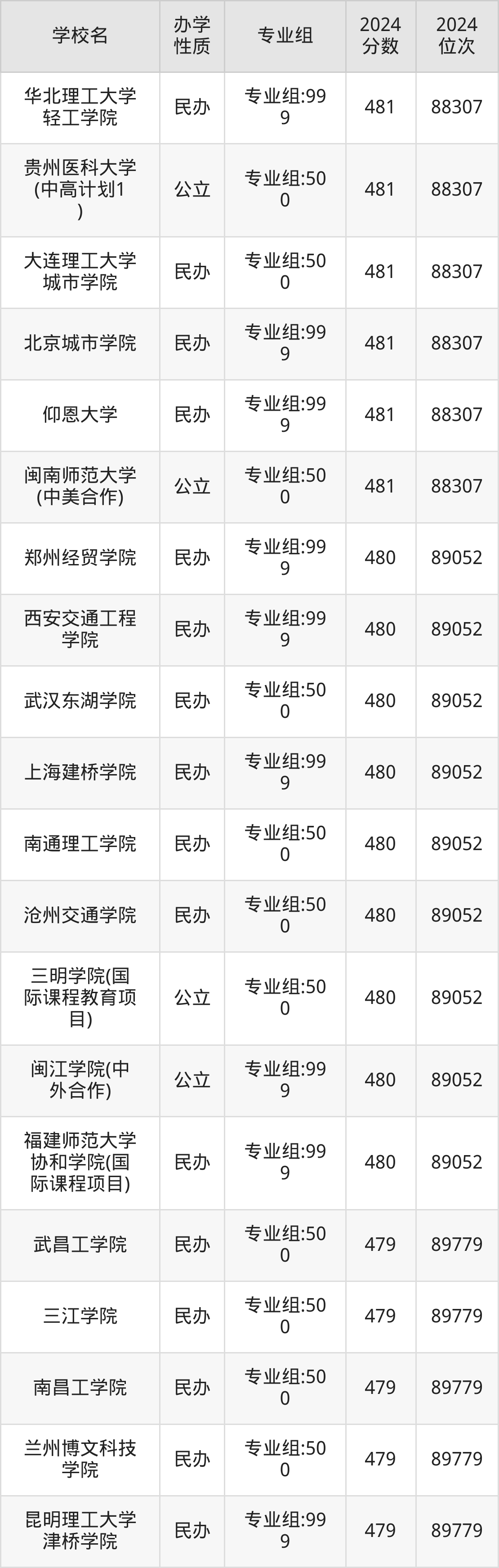 | 贵州医科大学 (中高计划1 ) | 专业组:50 0 | 481 | 88307 |