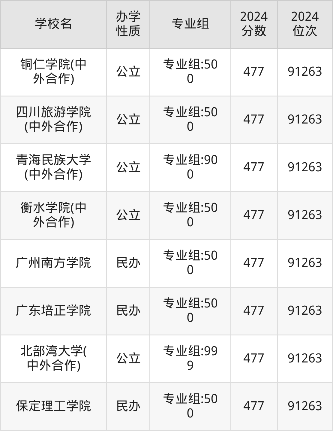 | 铜仁学院(中 外合作) | 专业组:50 0 | 477 | 91263 |