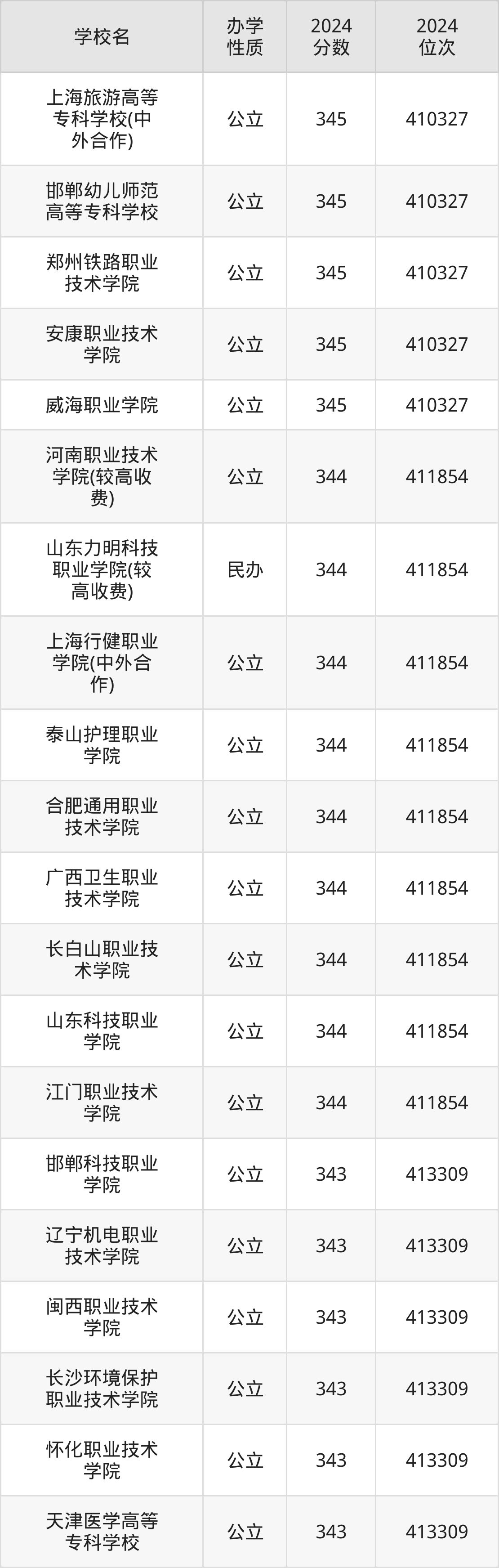 | 山东力明科技 职业学院(较 高收费) | 344 | 411854 |