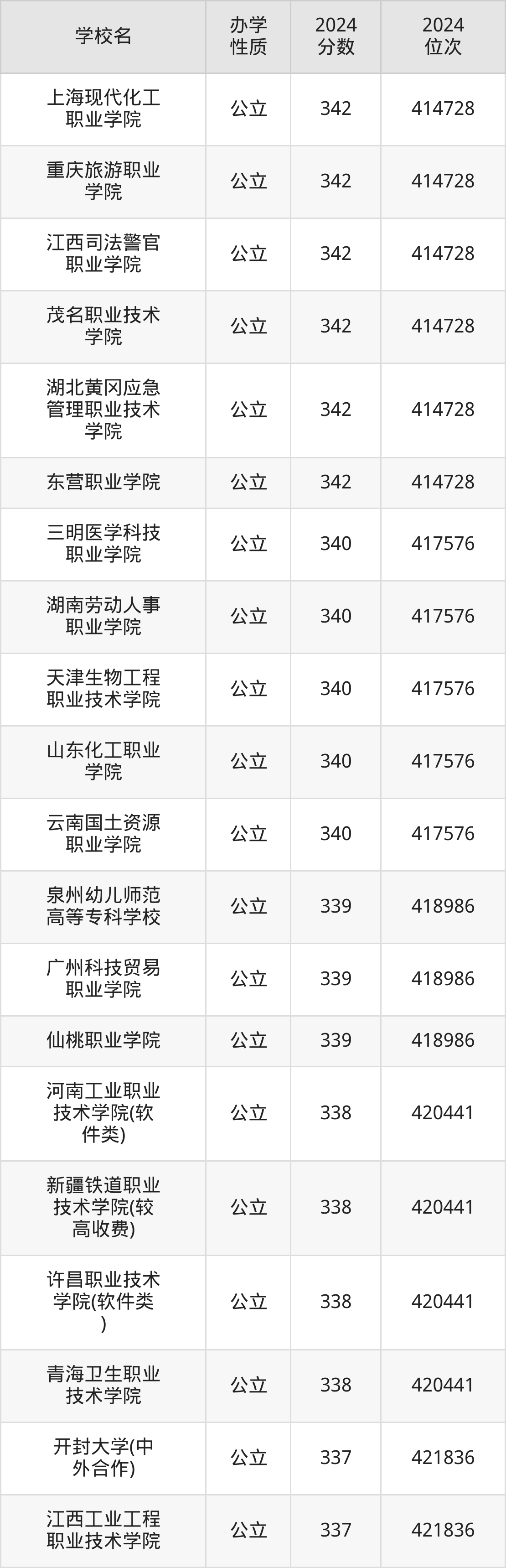 | 江西司法警官 职业学院 | 342 | 414728 |