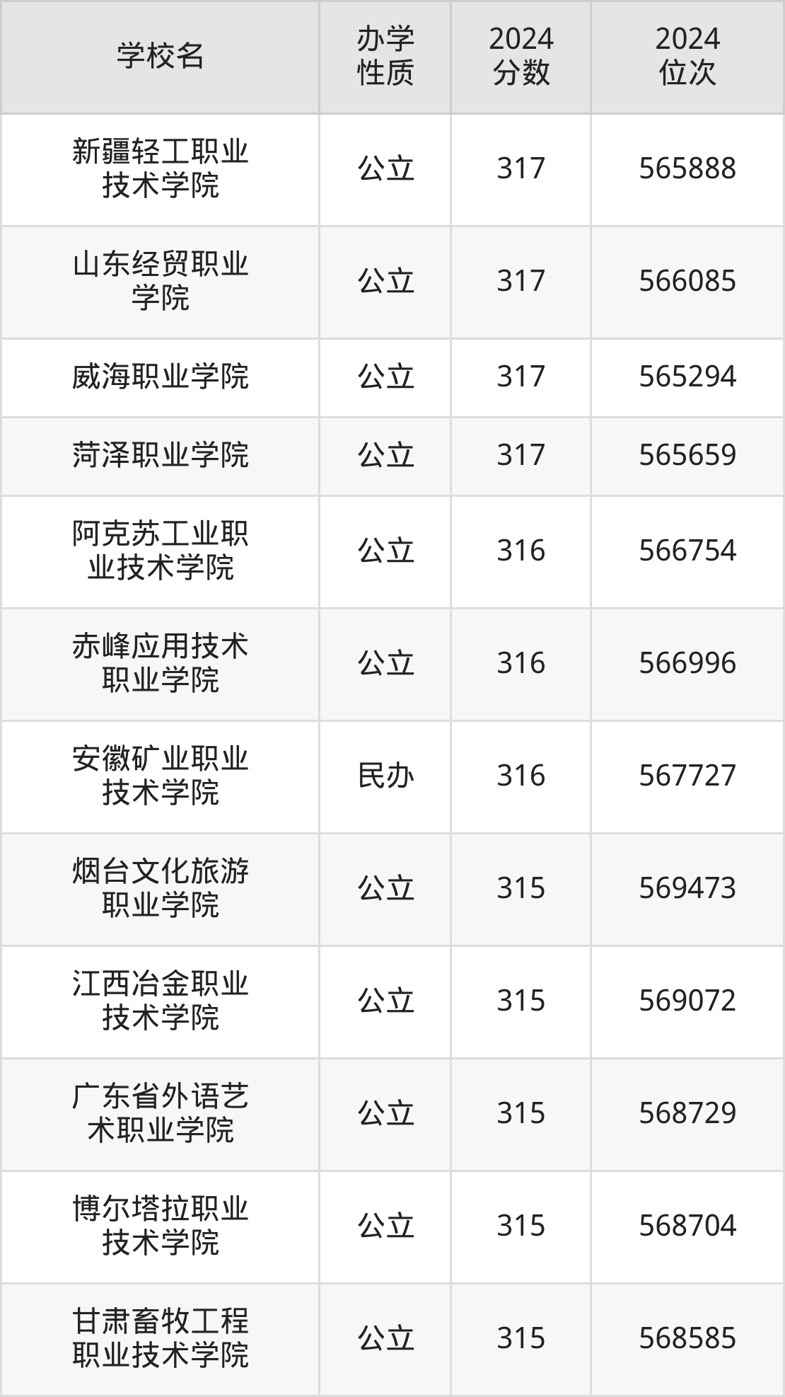 | 甘肃畜牧工程 职业技术学院 | 315 | 568585 |