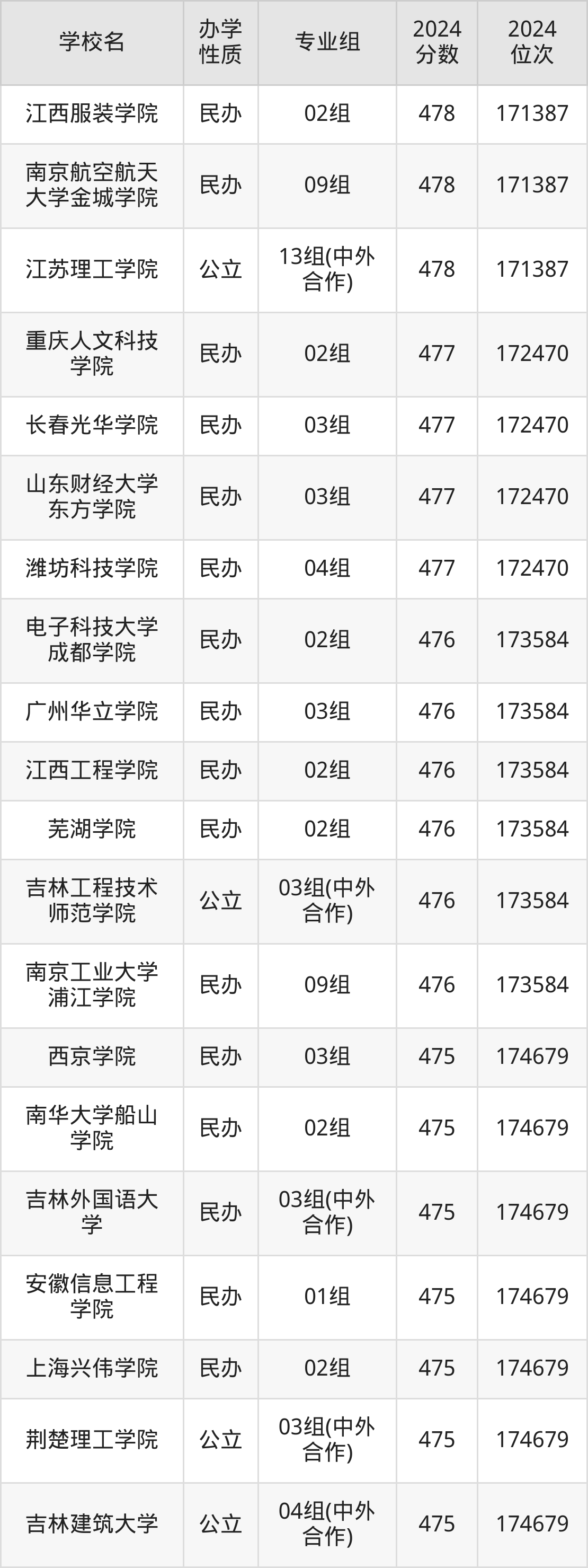 | 长春财经学院 | 02组(中外 合作) | 474 | 175746 |