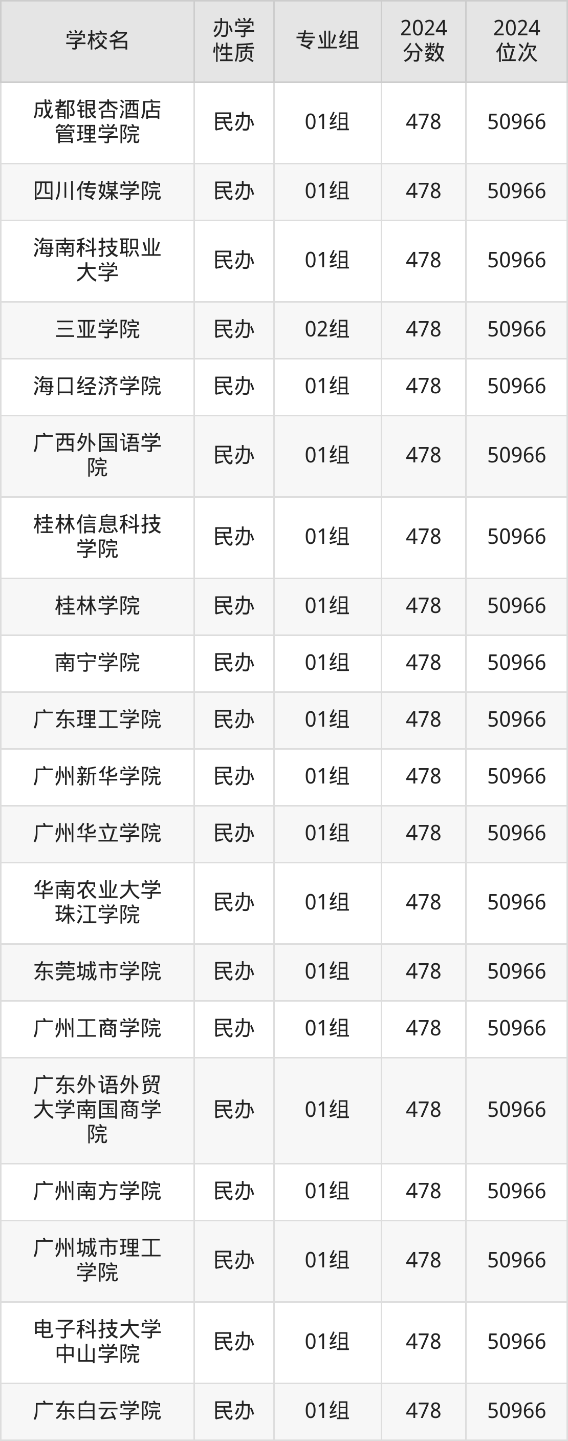 | 广州南方学院 | 01组 | 478 | 50966 |