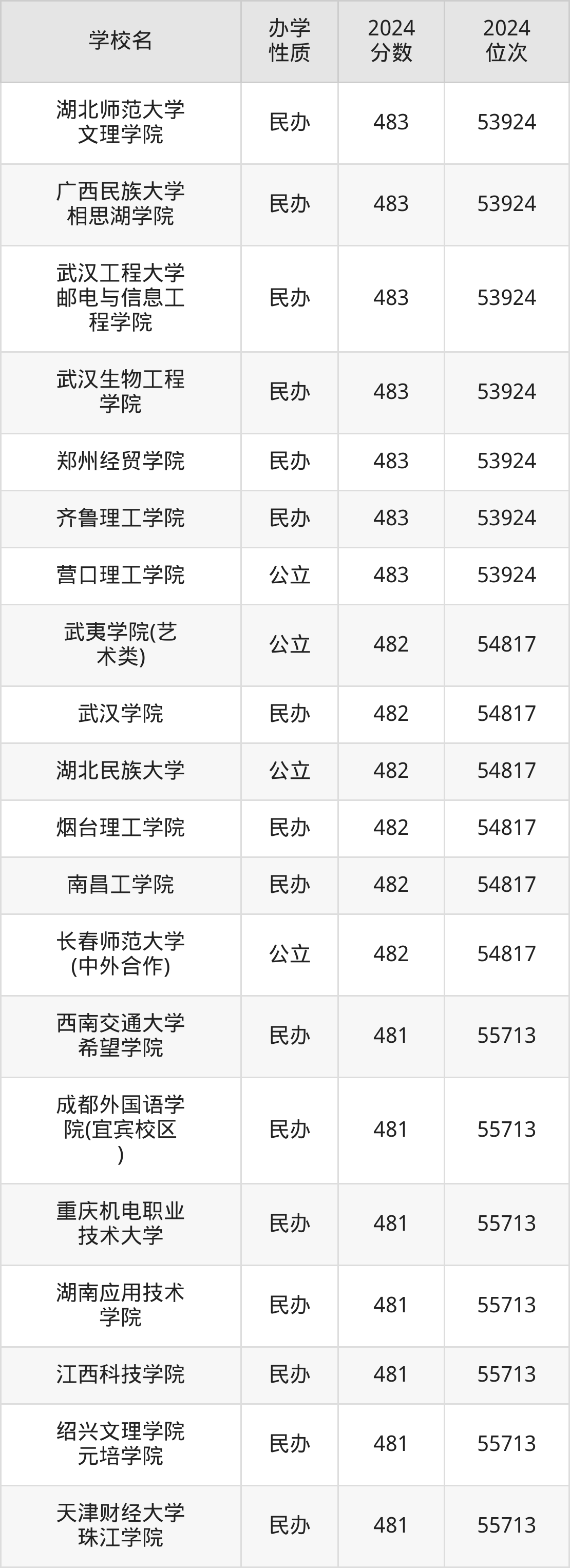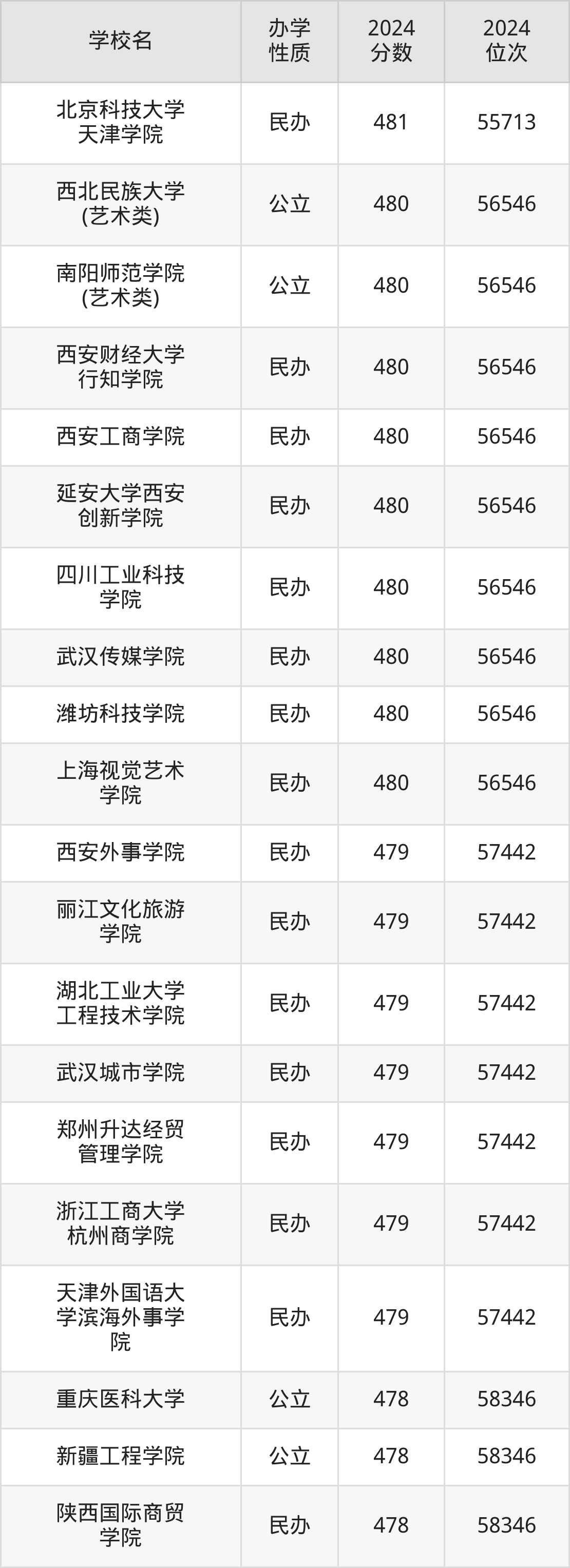 | 西安财经大学 行知学院 | 480 | 56546 |