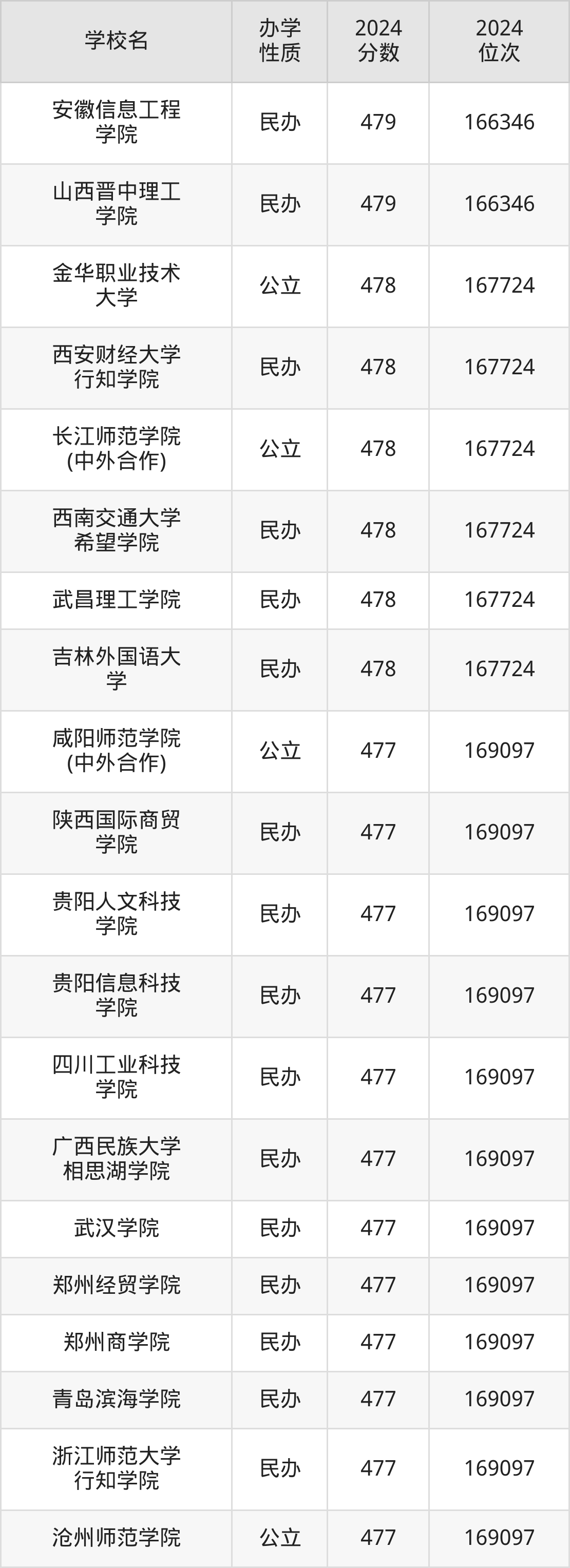| 西安财经大学 行知学院 | 478 | 167724 |