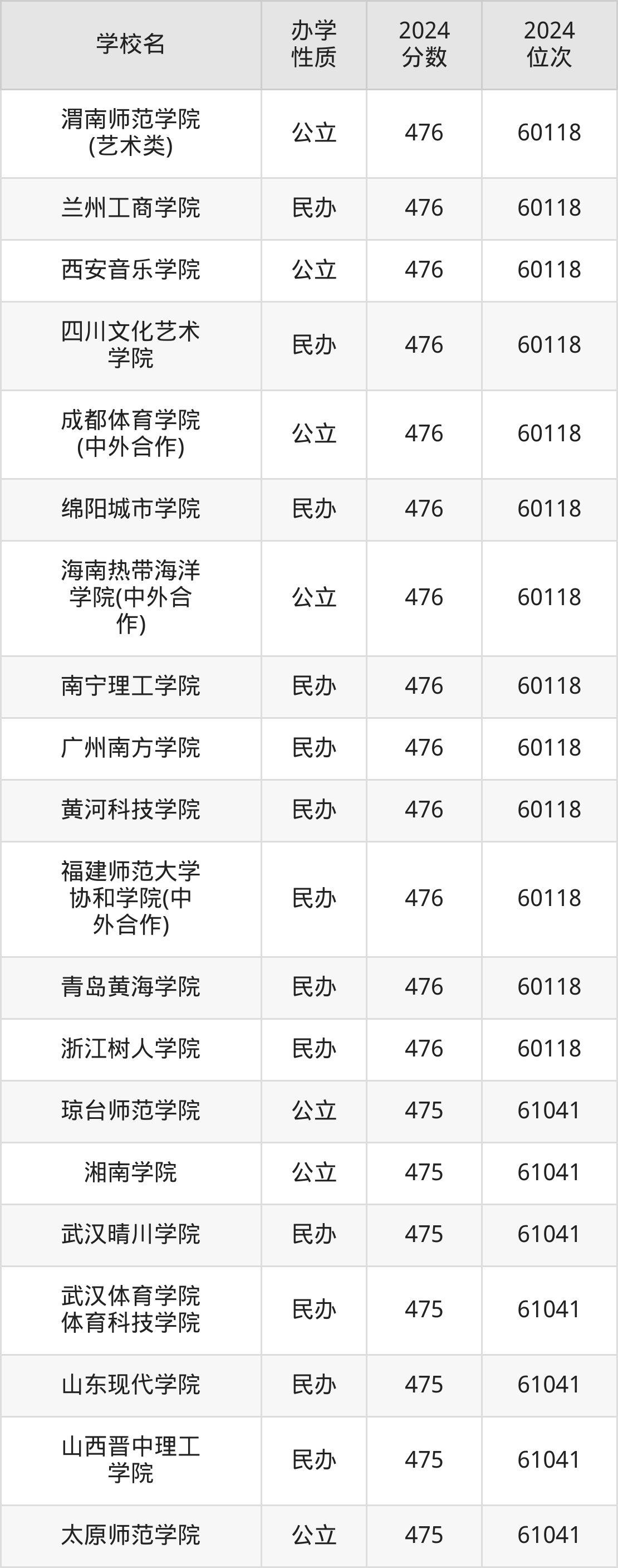 | 渭南师范学院 (艺术类) | 476 | 60118 |
