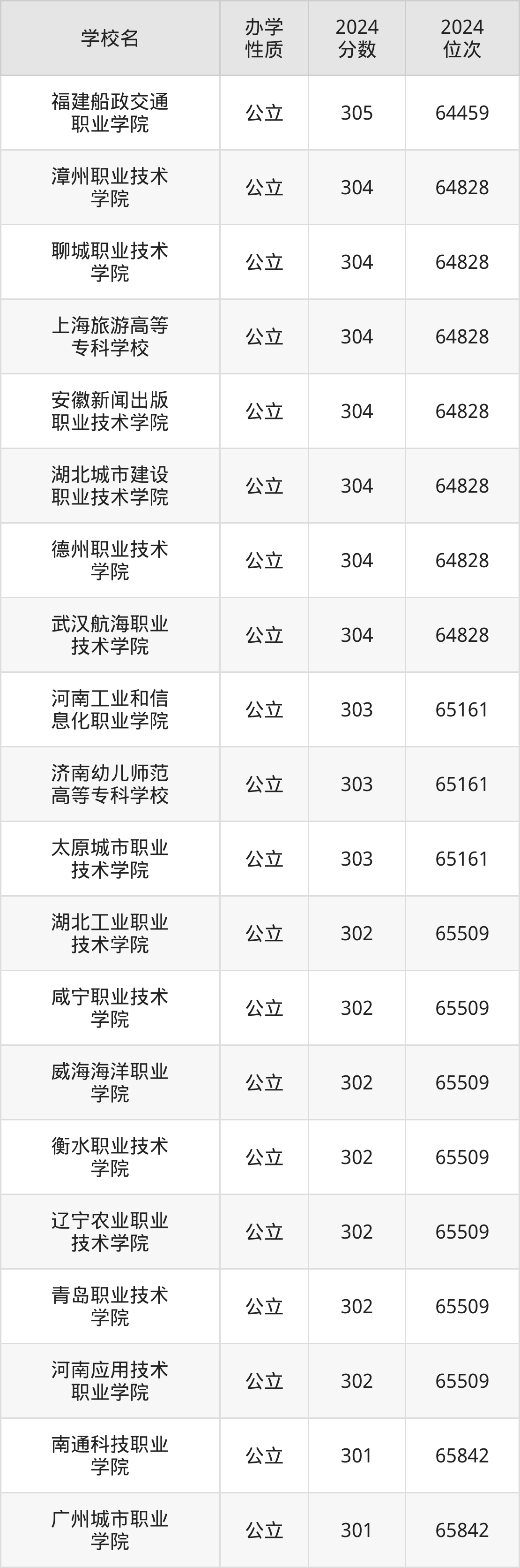 | 广州城市职业 学院 | 301 | 65842 |