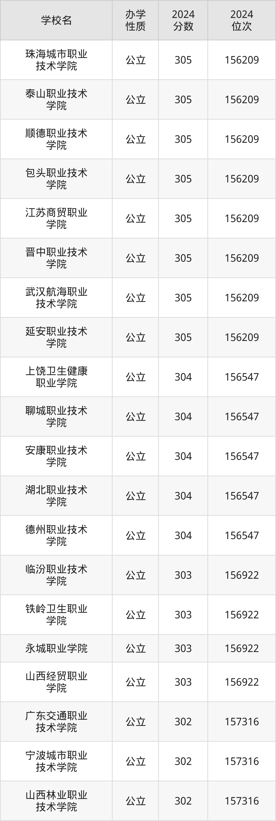 | 山西经贸职业 学院 | 303 | 156922 |