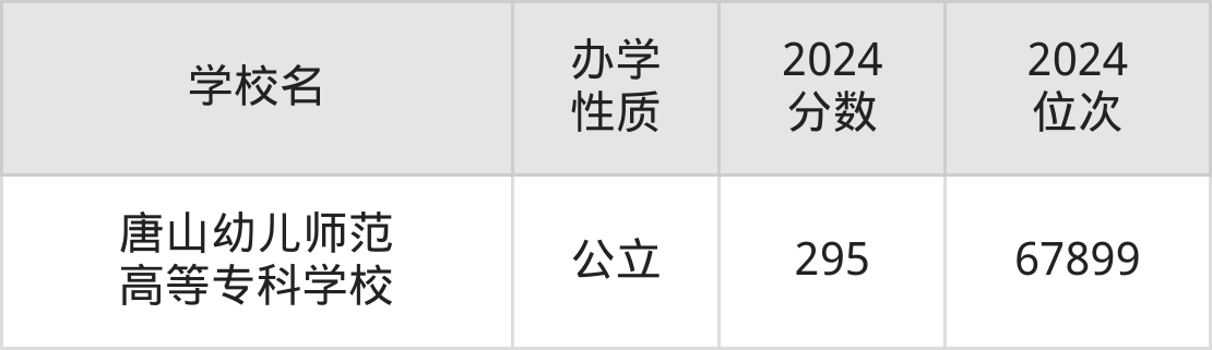 | 唐山幼儿师范 高等专科学校 | 295 | 67899 |