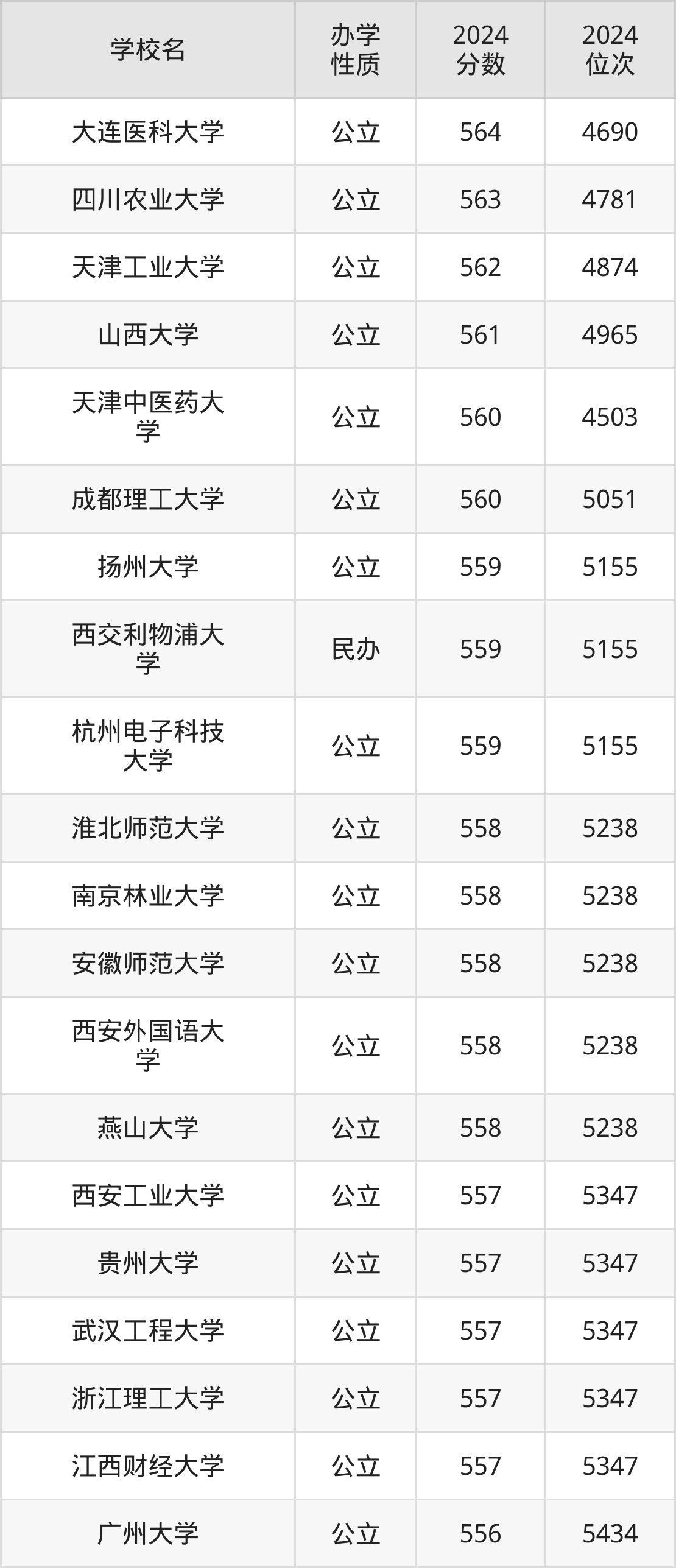 辽宁559分左右的考生可以上大连医科大学、四川农业大学、天津工业大学等院校,刚好在559分的院校有扬州大学、西交利物浦大学、杭州电子科技大学。