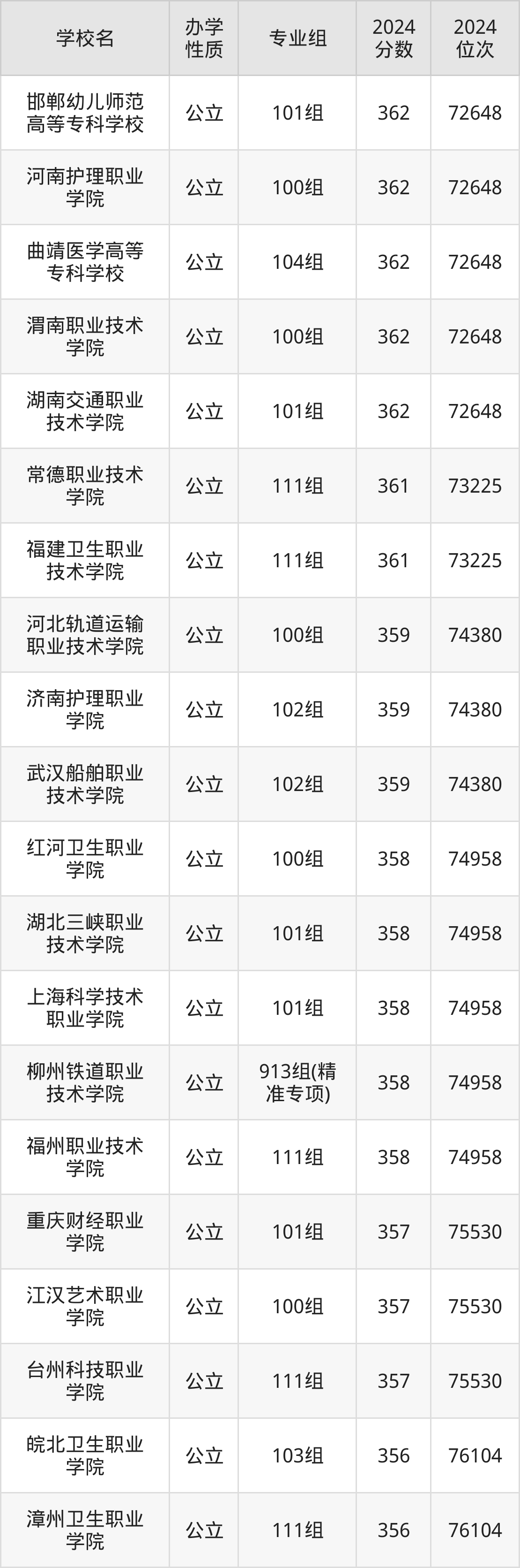 | 柳州铁道职业 技术学院 | 913组(精 准专项) | 358 | 74958 |