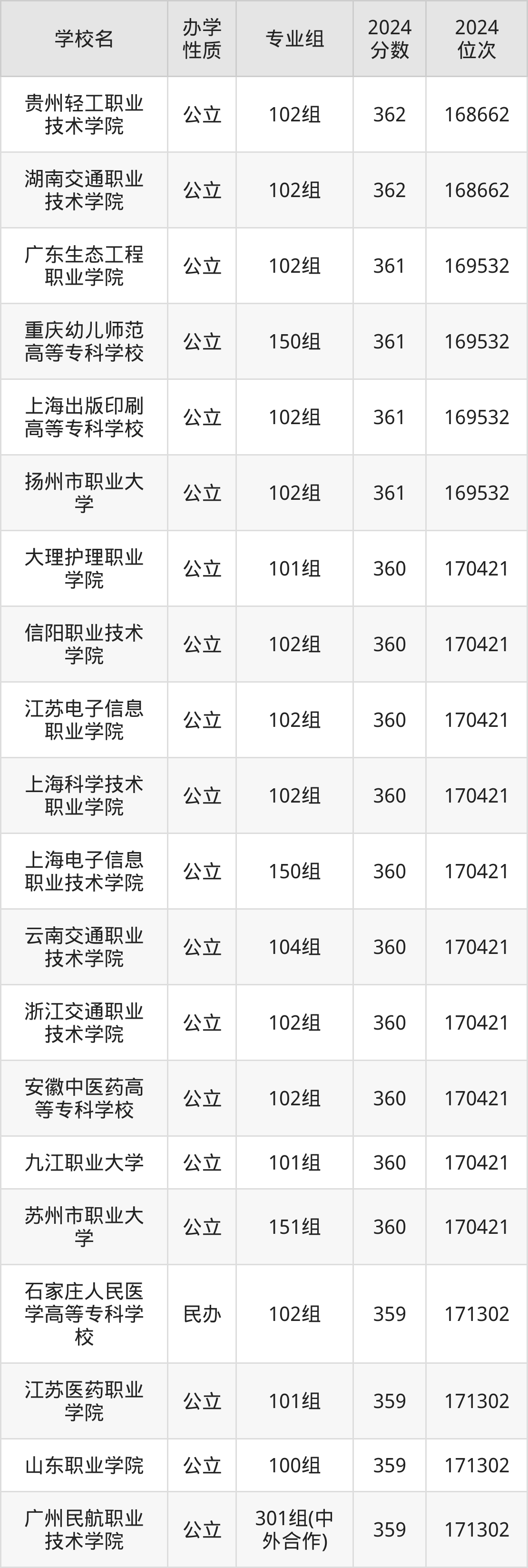 2024年广西物理类357分考生能上贵州轻工职业技术学院、湖南交通职业技术学院、广东生态工程职业学院、重庆幼儿师范高等专科学校、上海出版印刷高等专科学校等61所专科院校,具体录取分数线及位次为: