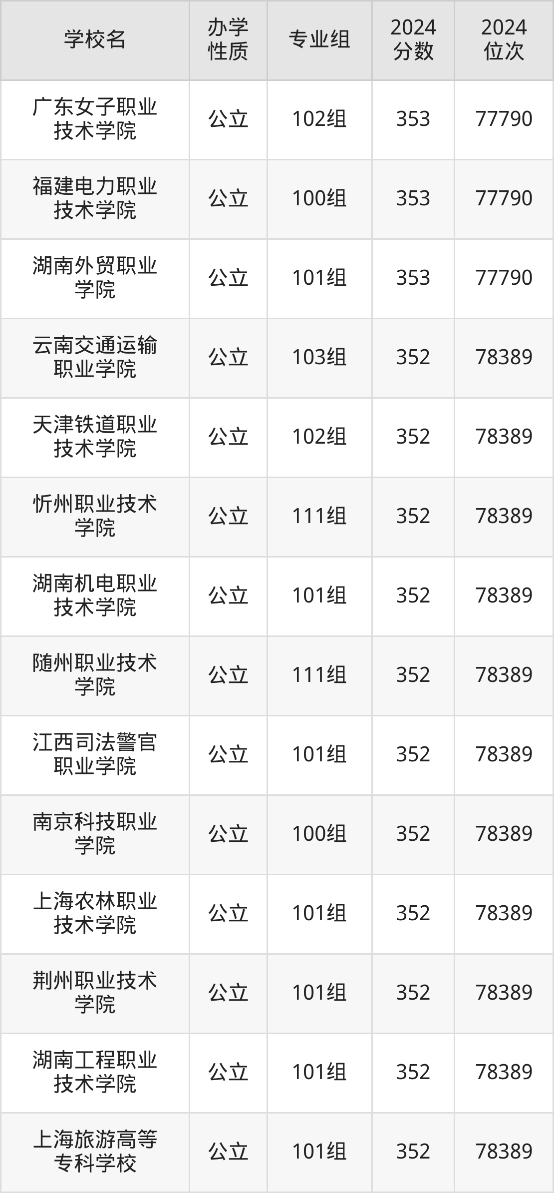 | 上海旅游高等 专科学校 | 101组 | 352 | 78389 |