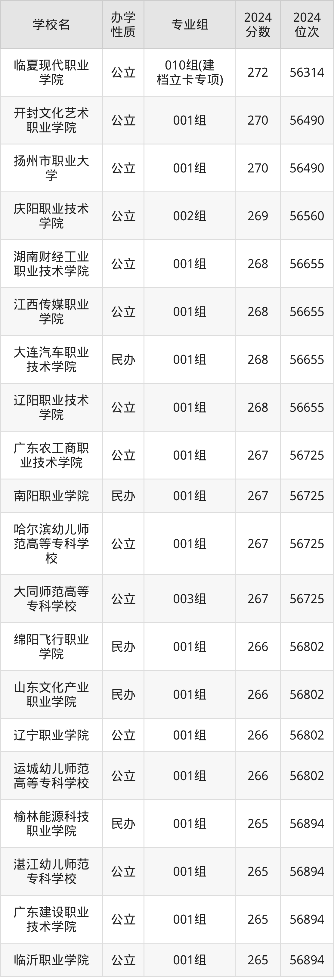 2024年甘肃历史类267分考生能上临夏现代职业学院、开封文化艺术职业学院、扬州市职业大学、庆阳职业技术学院、湖南财经工业职业技术学院等27所专科院校,具体录取分数线及位次为: