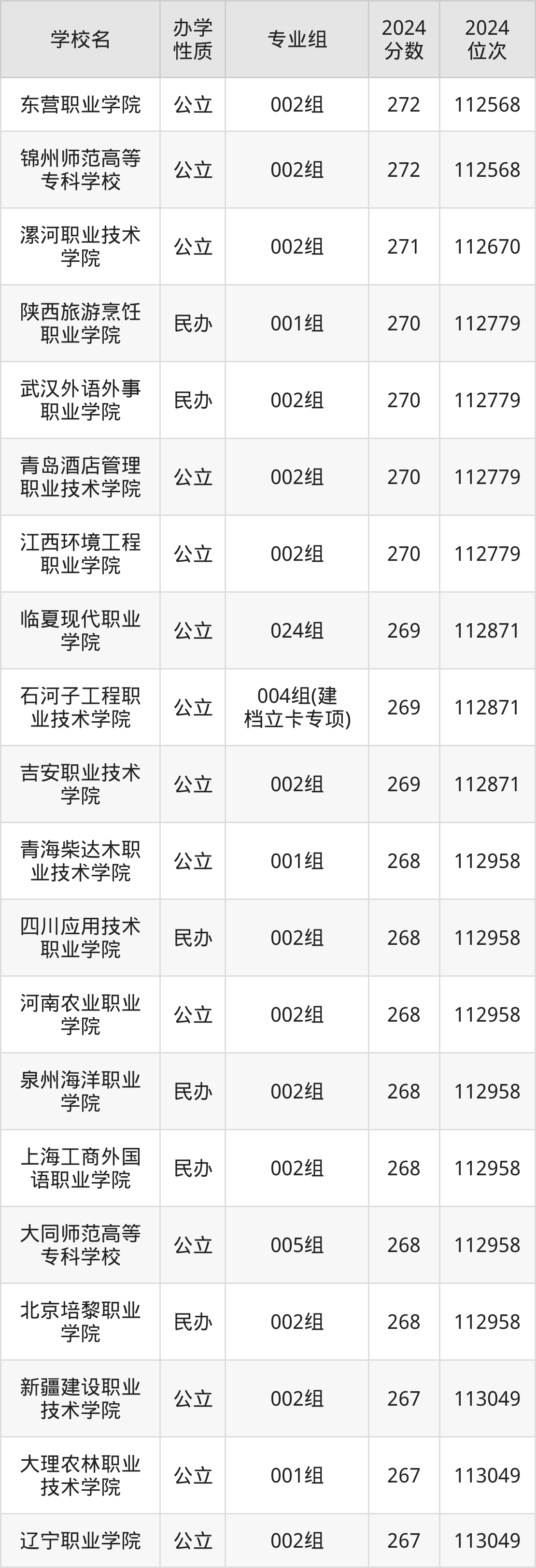2024年甘肃物理类267分考生能上东营职业学院、锦州师范高等专科学校、漯河职业技术学院、陕西旅游烹饪职业学院、武汉外语外事职业学院等33所专科院校,具体录取分数线及位次为: