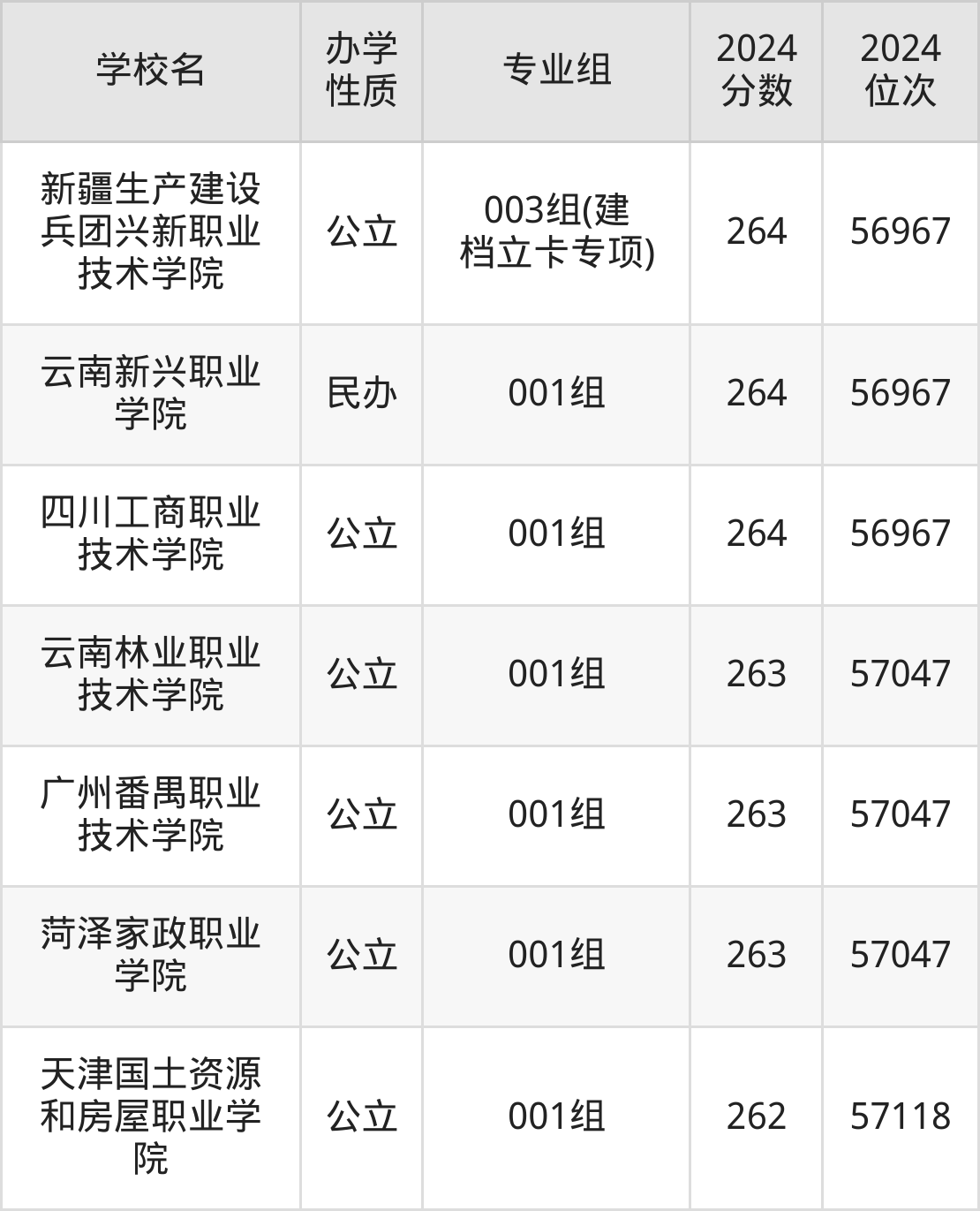 | 新疆生产建设 兵团兴新职业 技术学院 | 003组(建 档立卡专项) | 264 | 56967 |