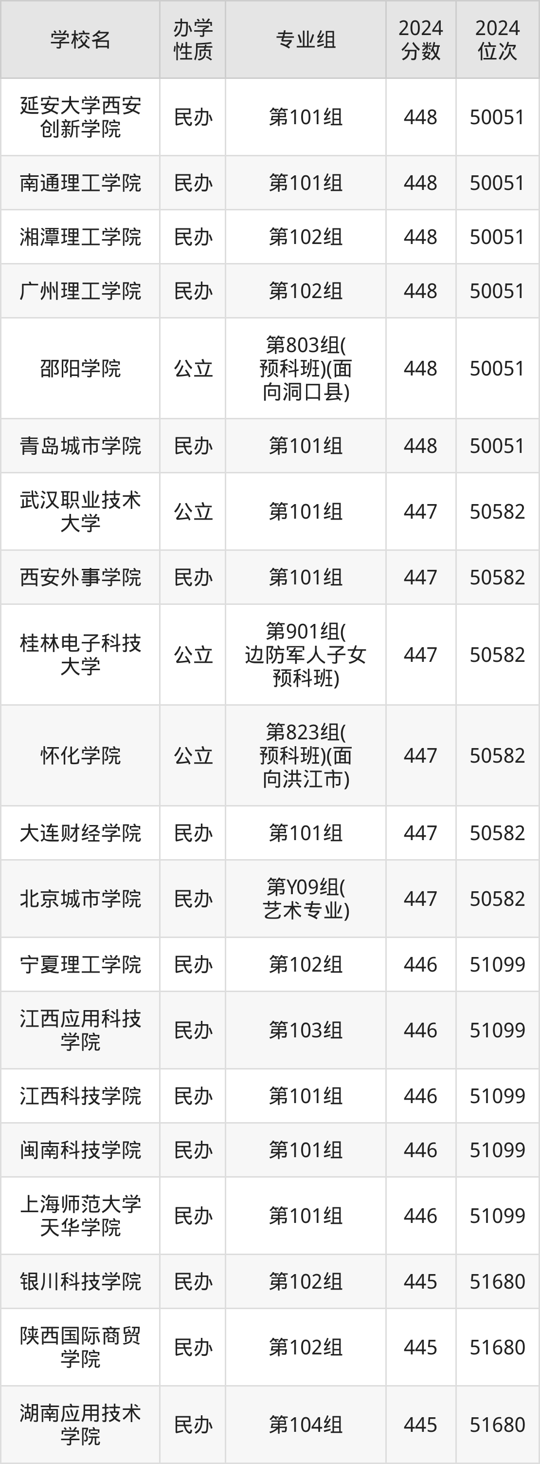 2024年湖南历史类443分考生能上延安大学西安创新学院、南通理工学院、湘潭理工学院、广州理工学院、邵阳学院等66所二本院校,具体录取分数线及位次为: