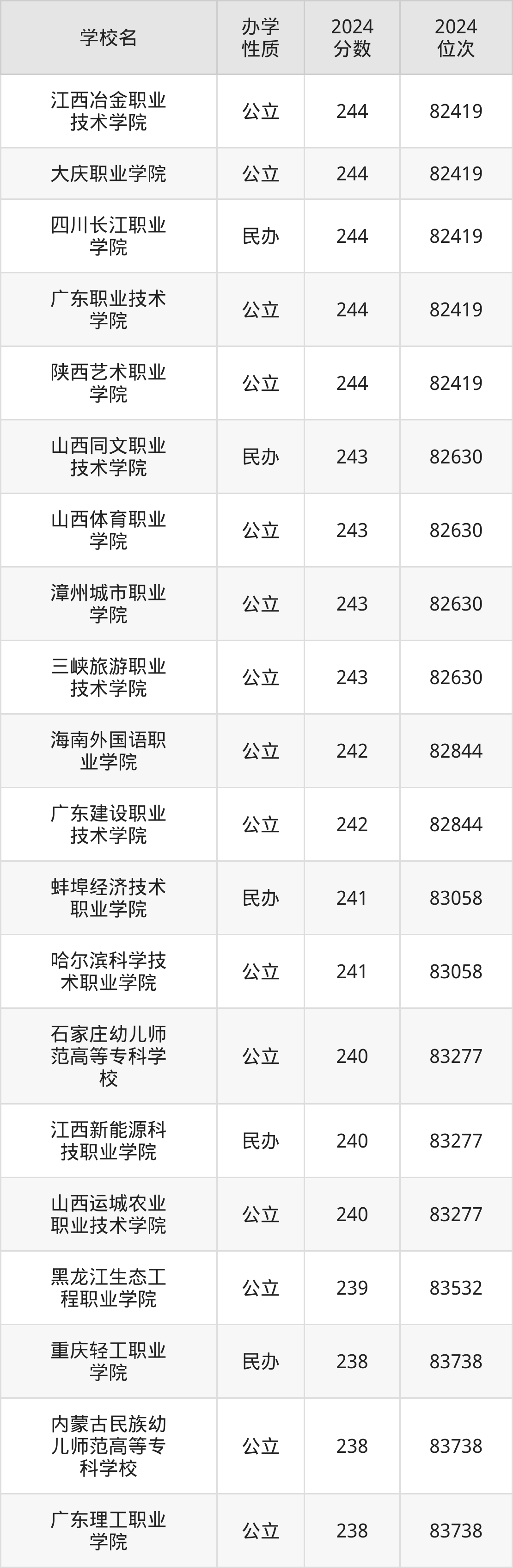 | 陕西艺术职业 学院 | 244 | 82419 |