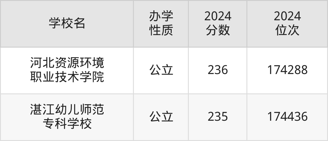 | 河北资源环境 职业技术学院 | 236 | 174288 |