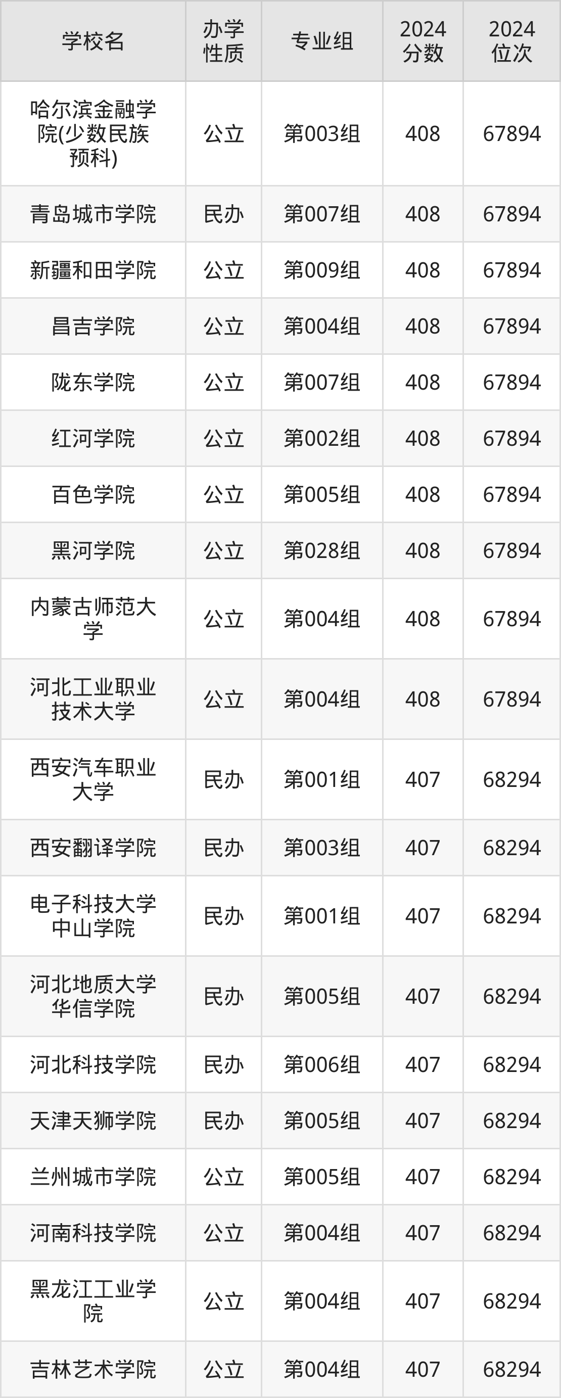 | 哈尔滨金融学 院(少数民族 预科) | 第003组 | 408 | 67894 |