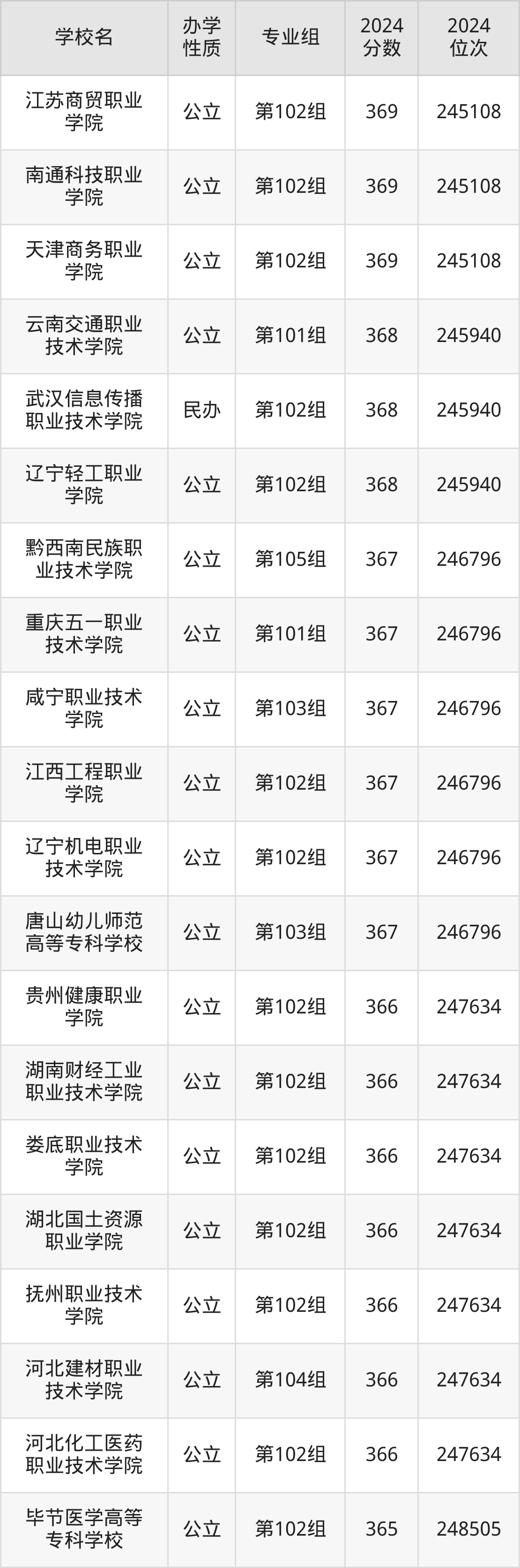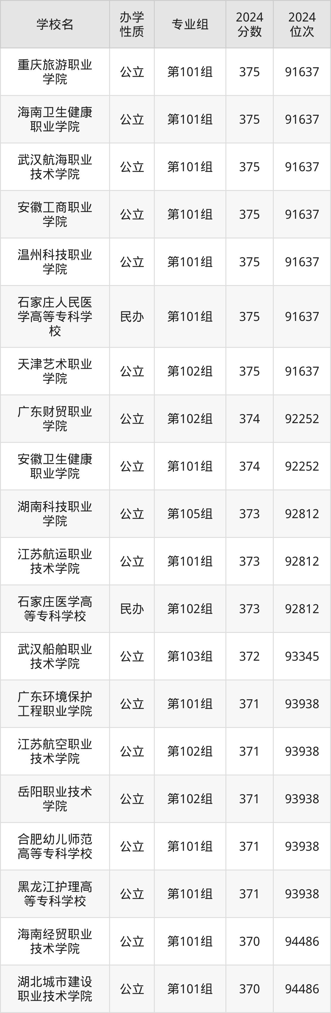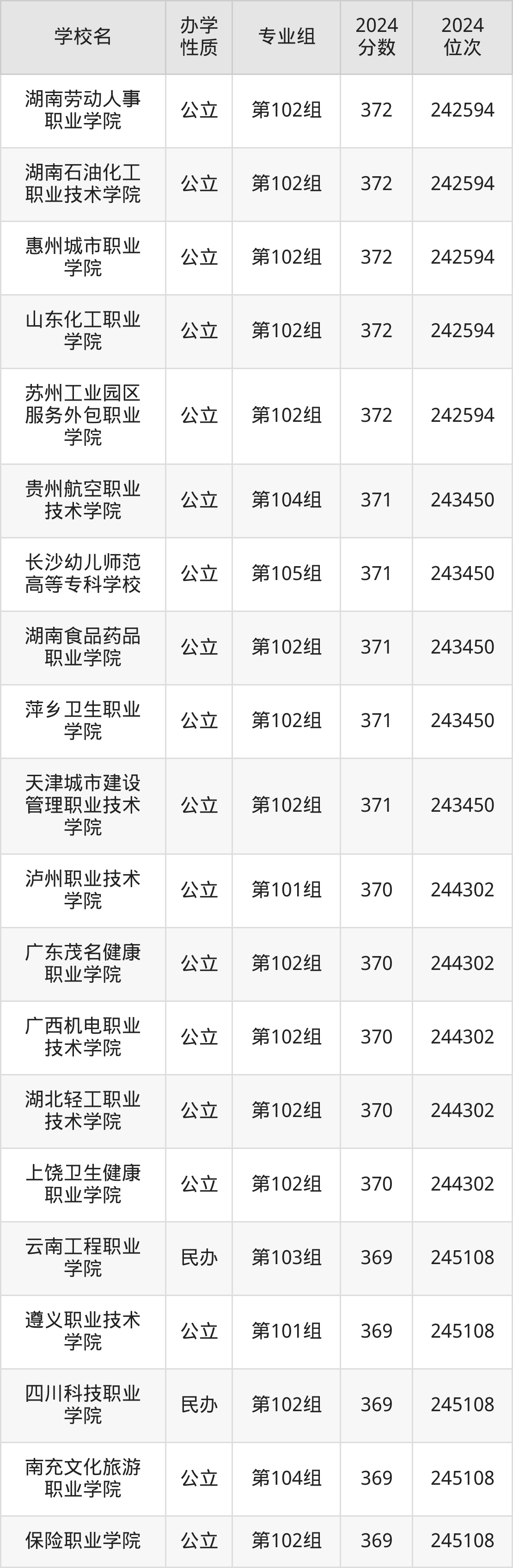 2024年湖南历史类370分考生能上重庆旅游职业学院、海南卫生健康职业学院、武汉航海职业技术学院、安徽工商职业学院、温州科技职业学院等37所专科院校,具体录取分数线及位次为: