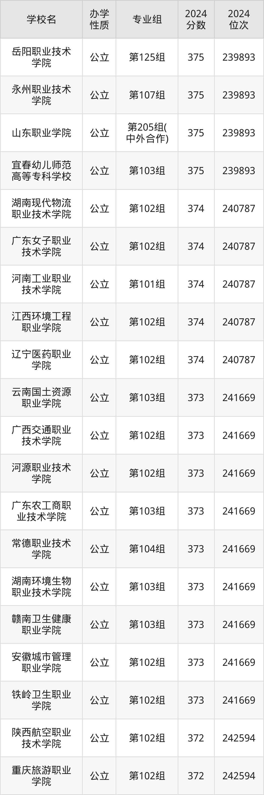 2024年湖南物理类370分考生能上岳阳职业技术学院、永州职业技术学院、山东职业学院、宜春幼儿师范高等专科学校、湖南现代物流职业技术学院等65所专科院校,具体录取分数线及位次为: