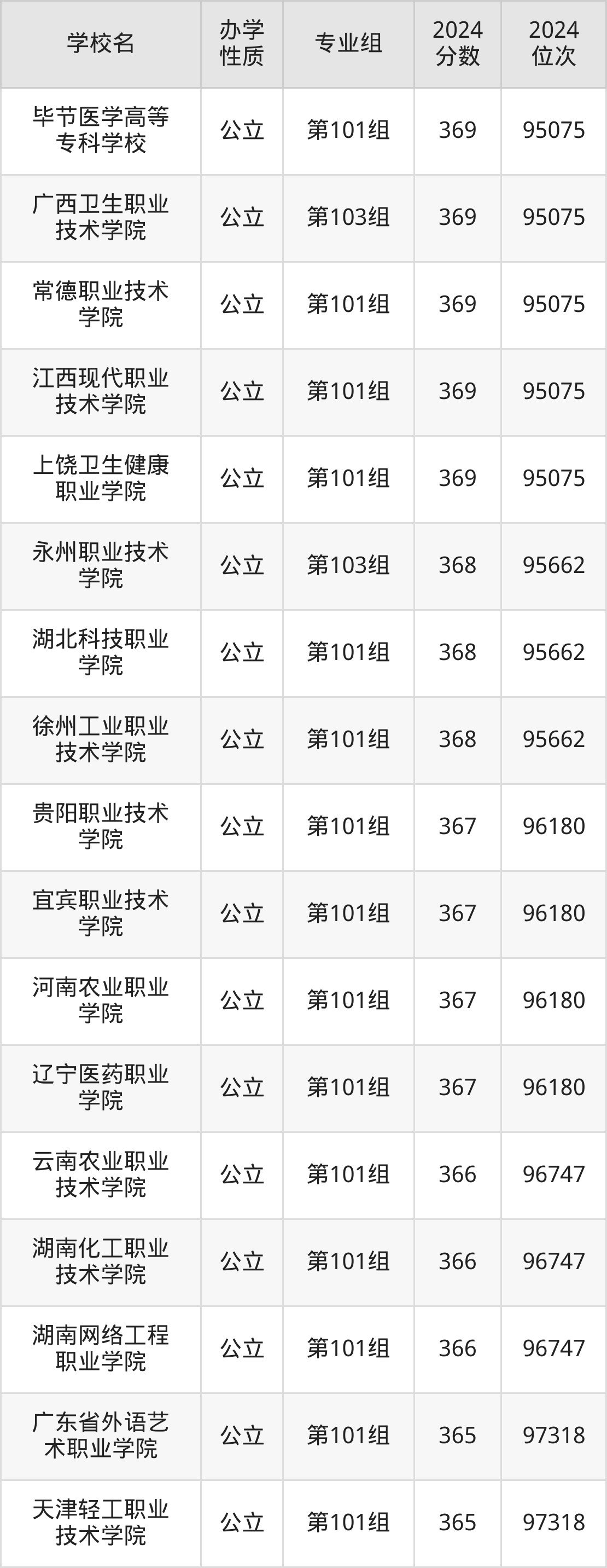 | 毕节医学高等 专科学校 | 第101组 | 369 | 95075 |