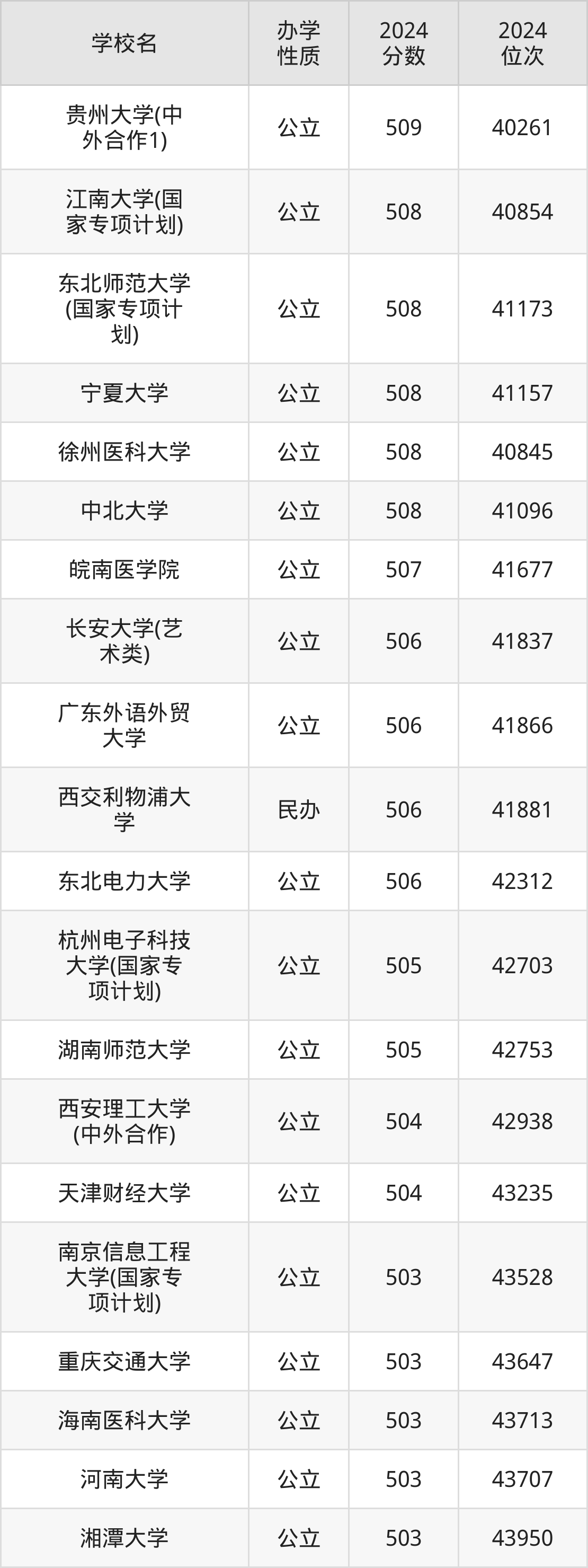 2024年陕西理科504分考生能上贵州大学(中外合作1)、江南大学(国家专项计划)、东北师范大学(国家专项计划)、宁夏大学、中北大学等38所一本院校,具体录取分数线及位次为: