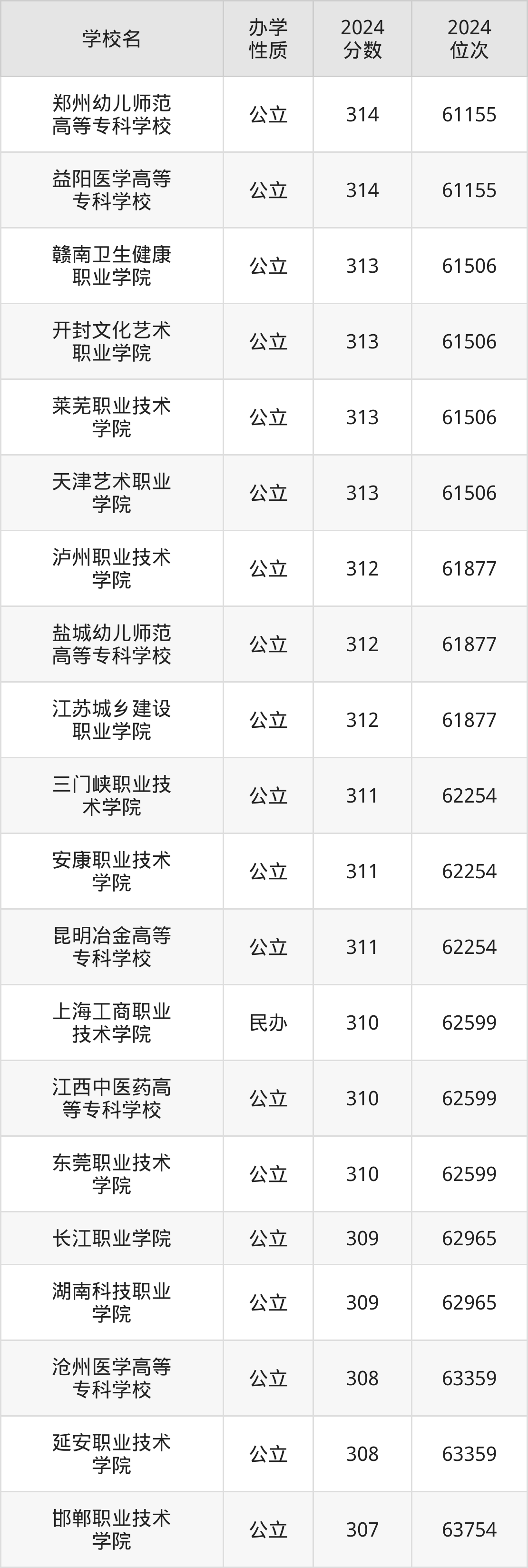 2024年山西文科309分考生能上郑州幼儿师范高等专科学校、益阳医学高等专科学校、赣南卫生健康职业学院、开封文化艺术职业学院、莱芜职业技术学院等33所专科院校,具体录取分数线及位次为: