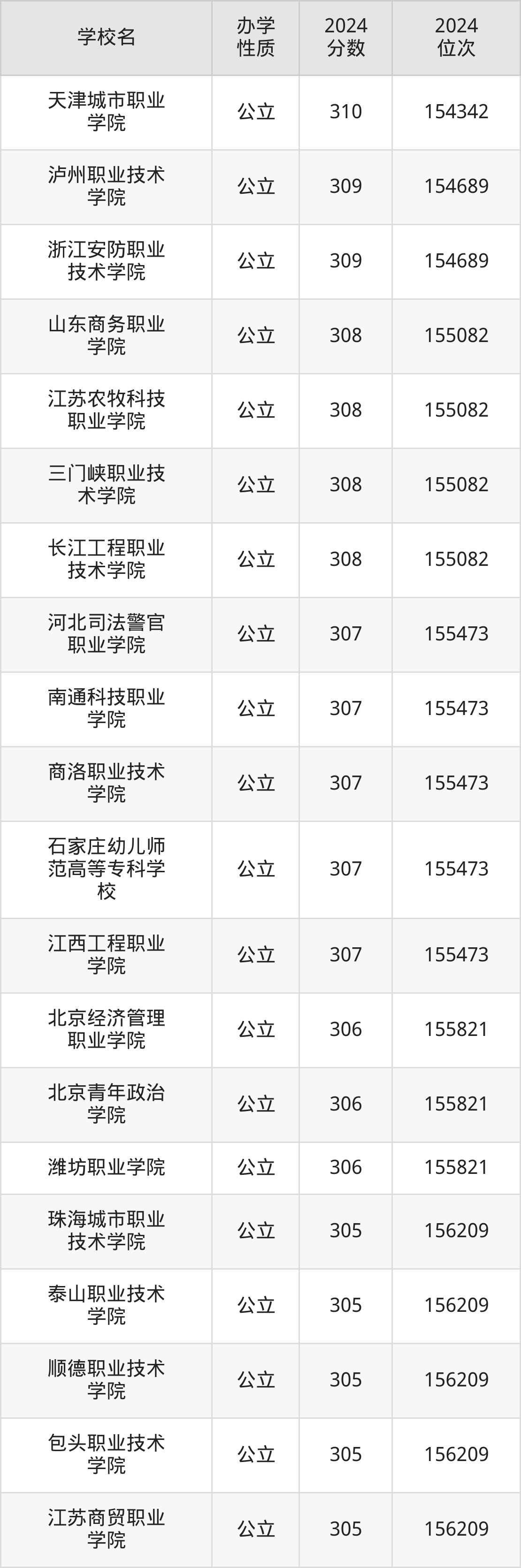 | 天津公安警官 职业学院 | 310 | 154342 |