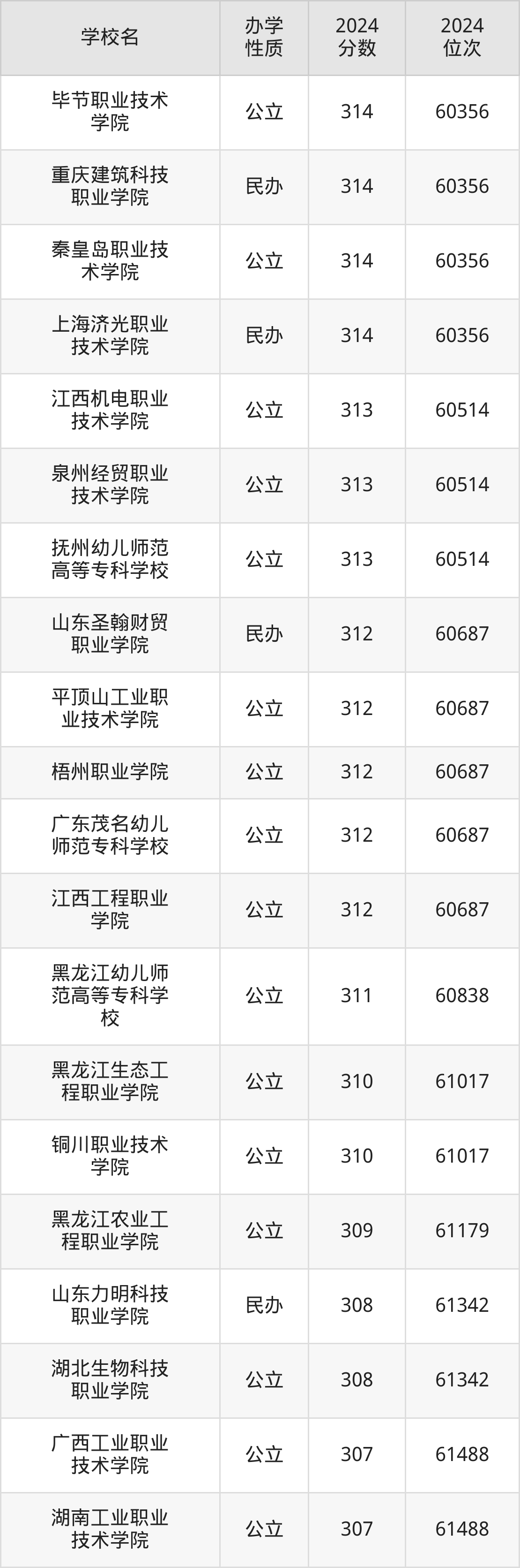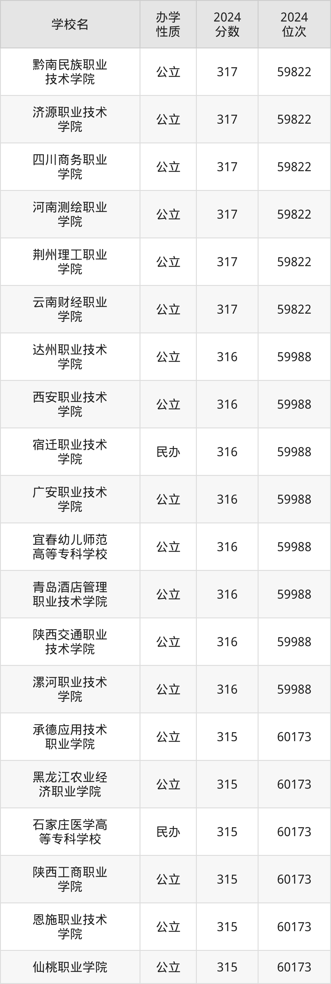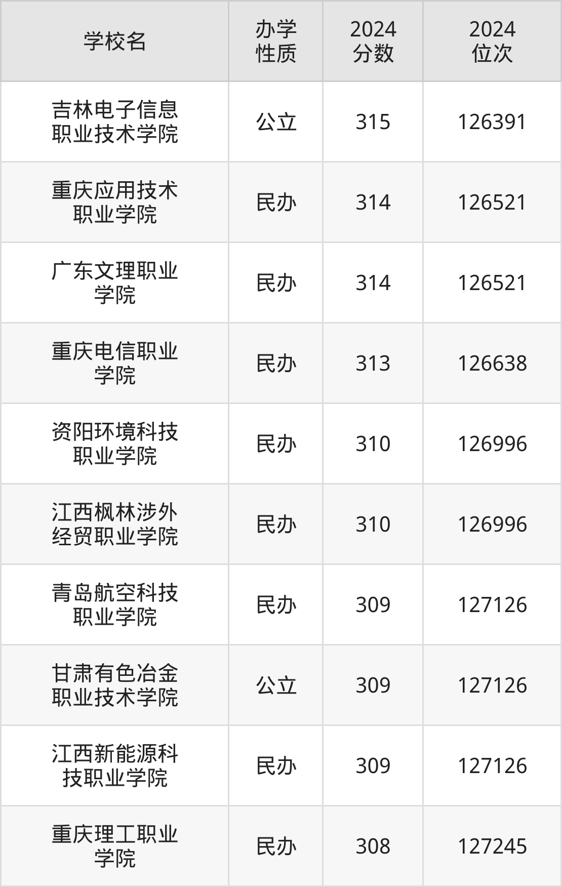 | 资阳环境科技 职业学院 | 310 | 126996 |