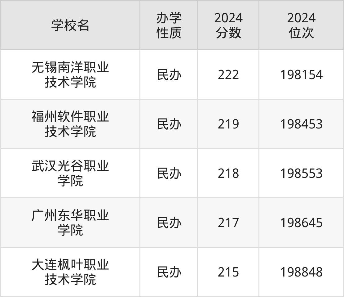 2024年四川文科220分考生能上无锡南洋职业技术学院、福州软件职业技术学院、武汉光谷职业学院、广州东华职业学院、大连枫叶职业技术学院5所专科院校,具体录取分数线及位次为: