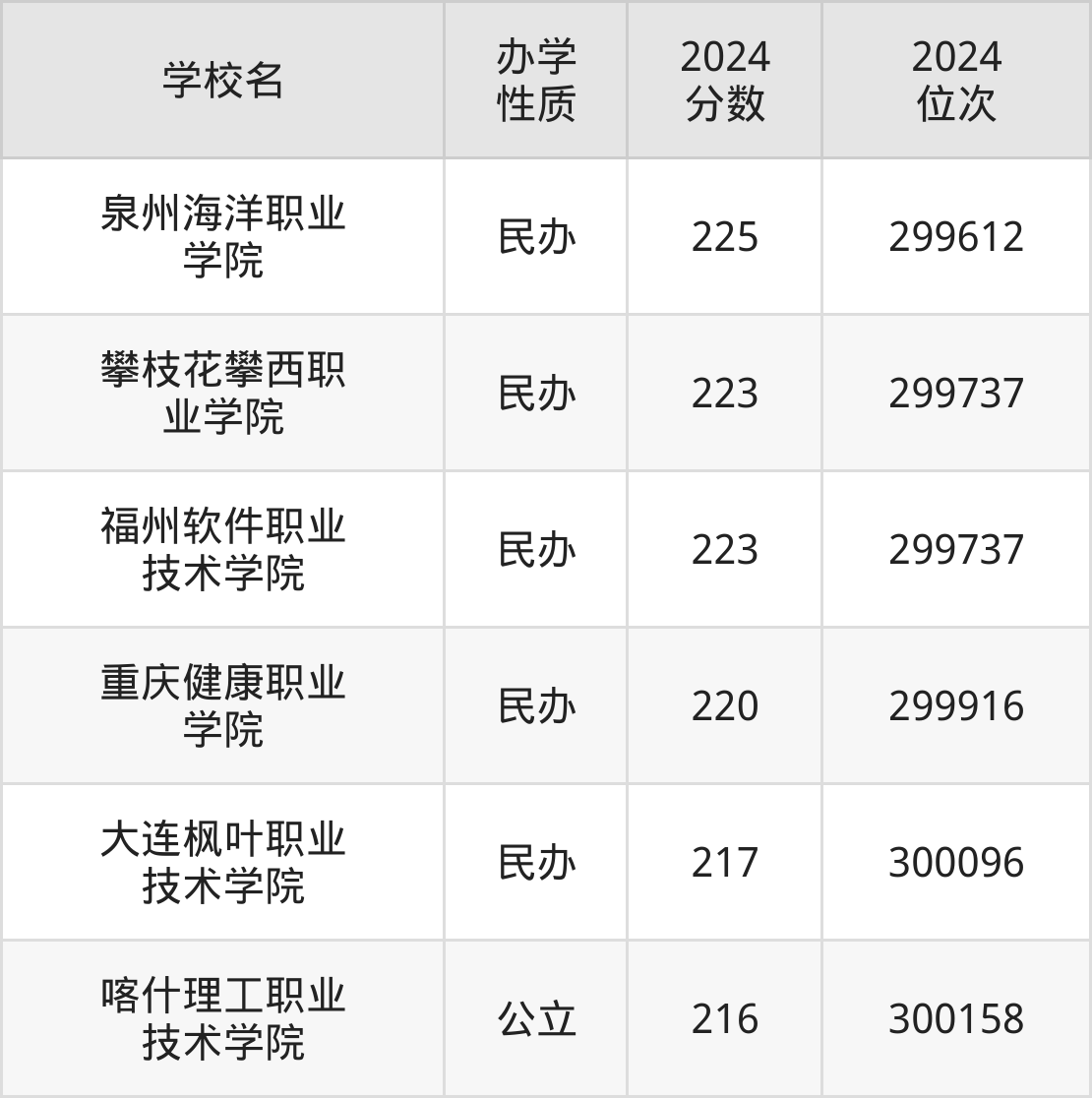 | 泉州海洋职业 学院 | 225 | 299612 |