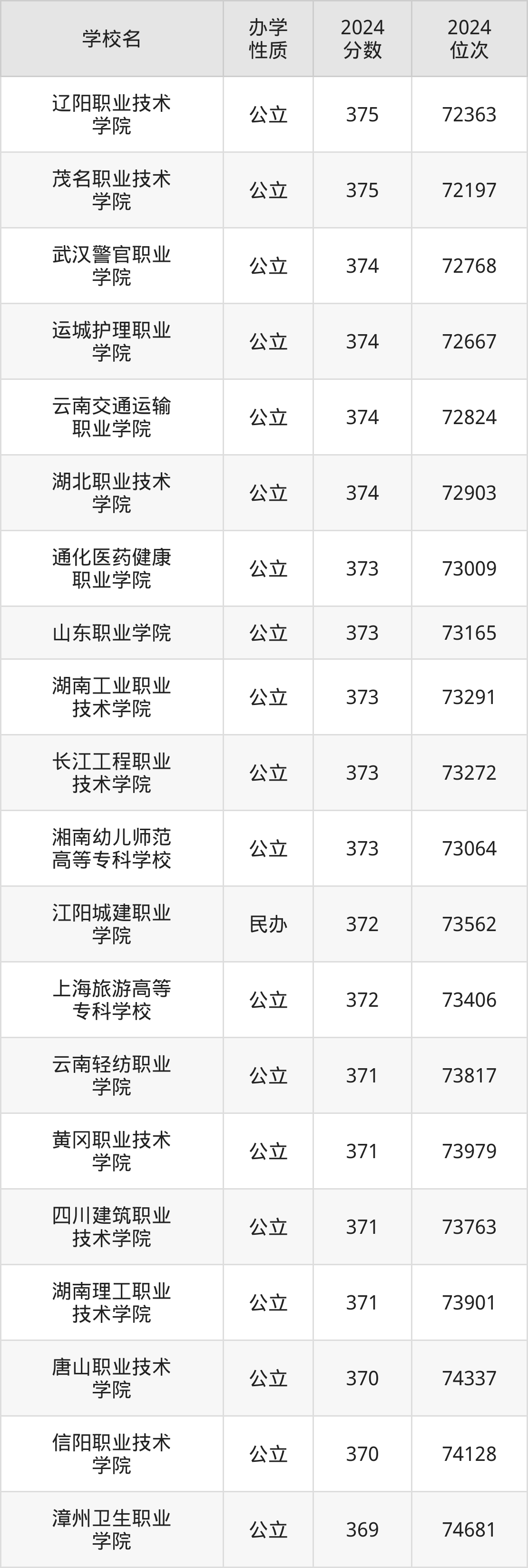 | 辽阳职业技术 学院 | 375 | 72363 |