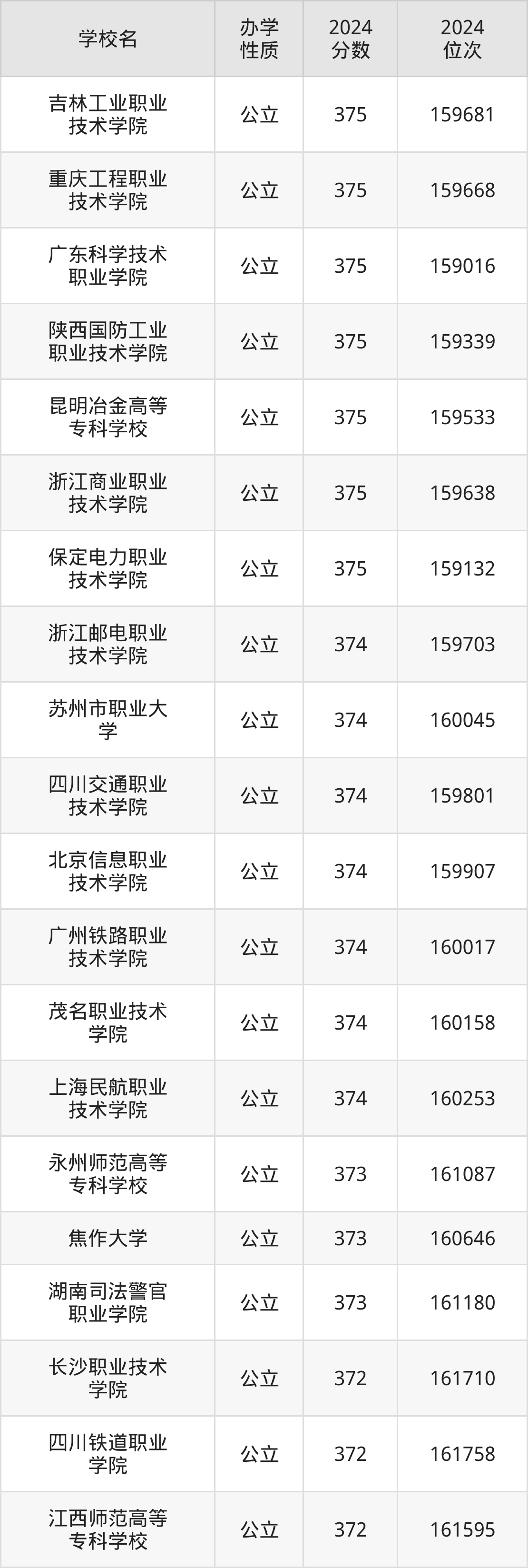 | 吉林工业职业 技术学院 | 375 | 159681 |