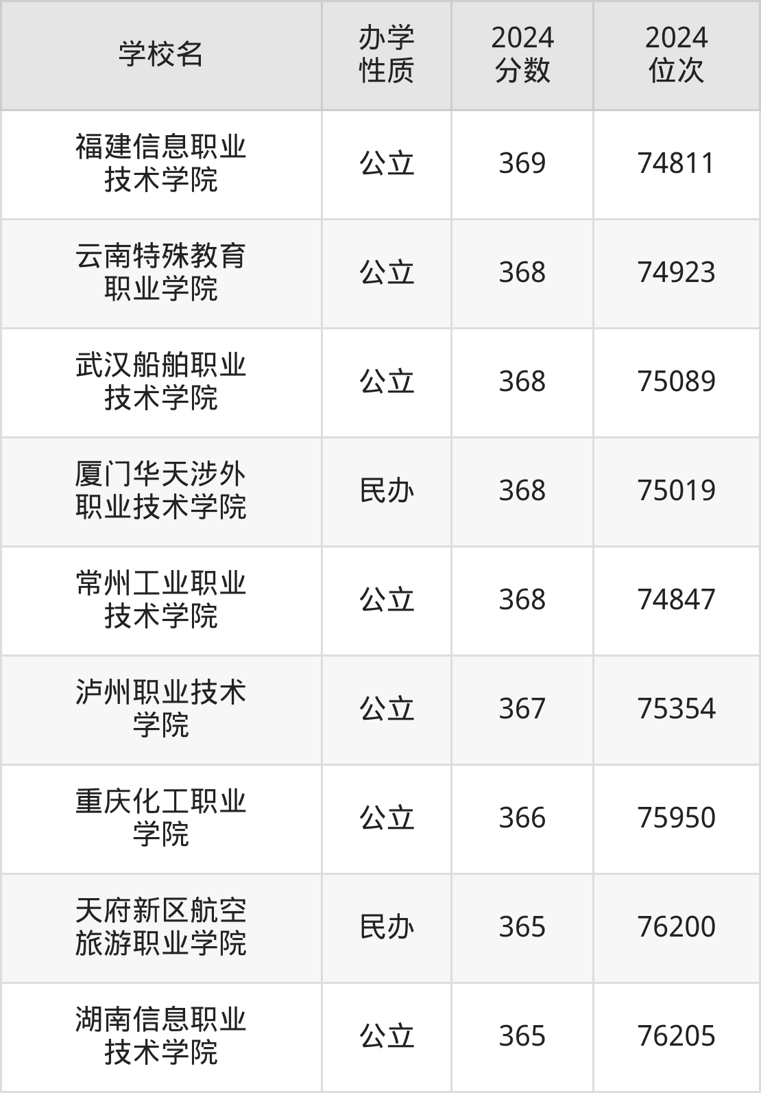| 福建信息职业 技术学院 | 369 | 74811 |