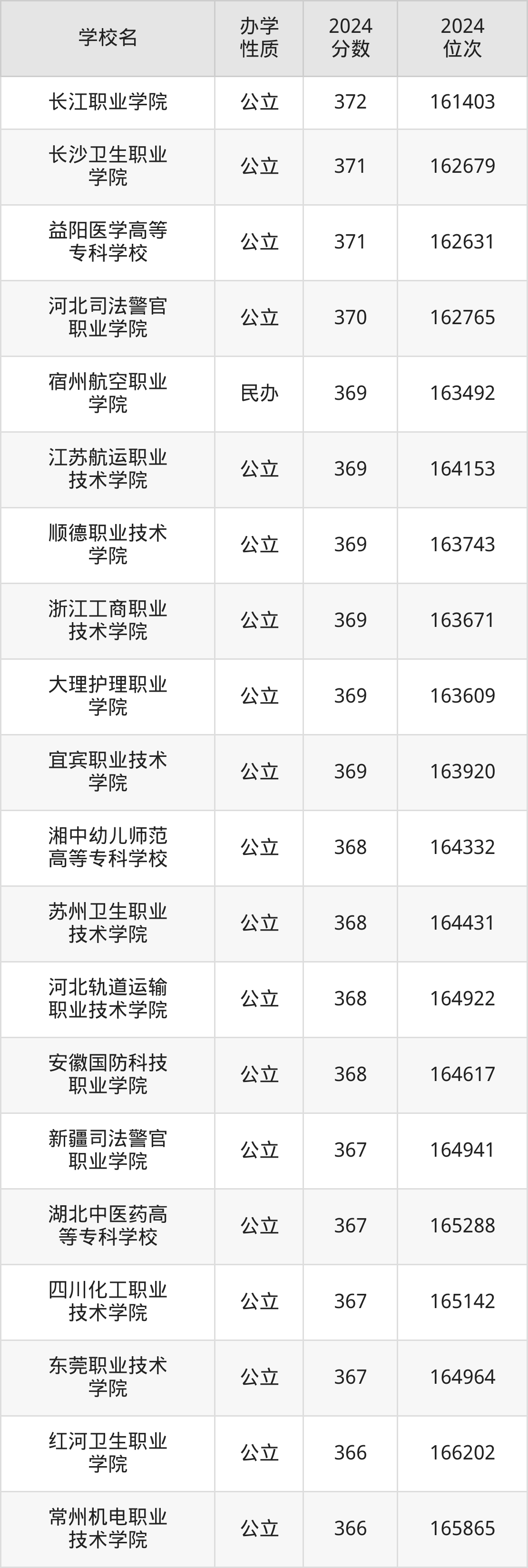 | 长沙卫生职业 学院 | 371 | 162679 |