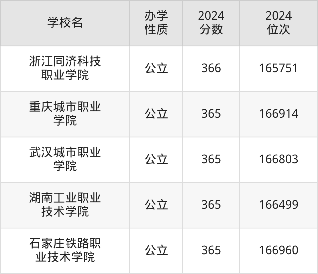 | 浙江同济科技 职业学院 | 366 | 165751 |