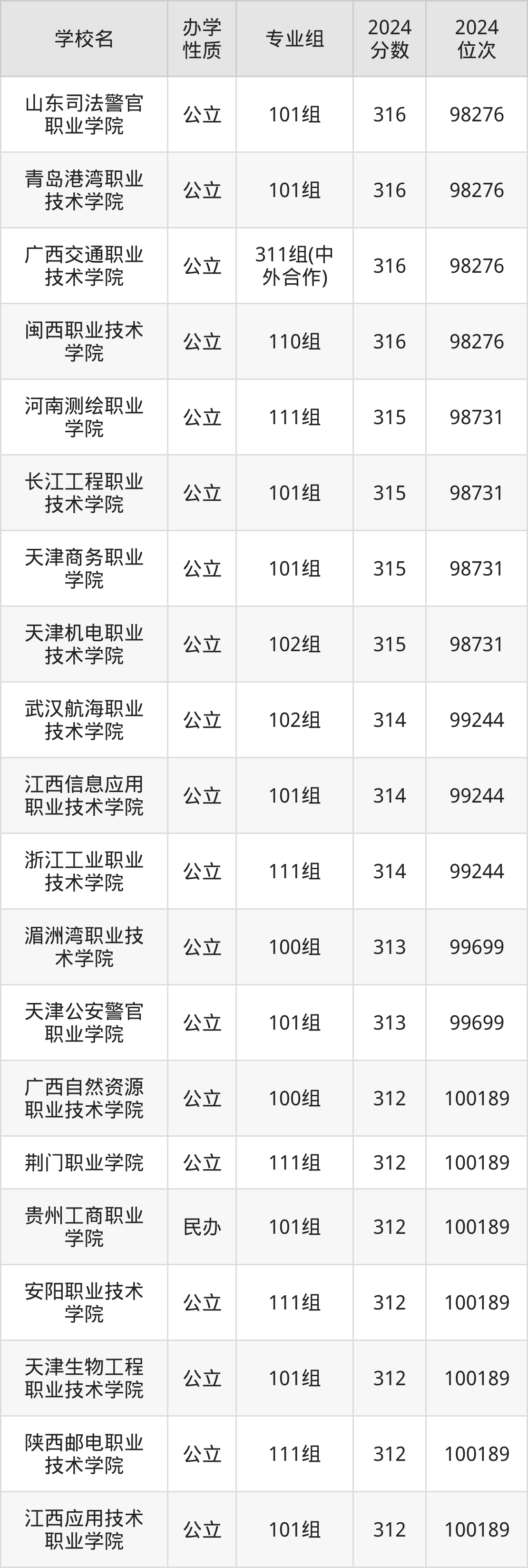 2024年广西历史类311分考生能上山东司法警官职业学院、青岛港湾职业技术学院、广西交通职业技术学院、闽西职业技术学院、河南测绘职业学院等42所专科院校,具体录取分数线及位次为: