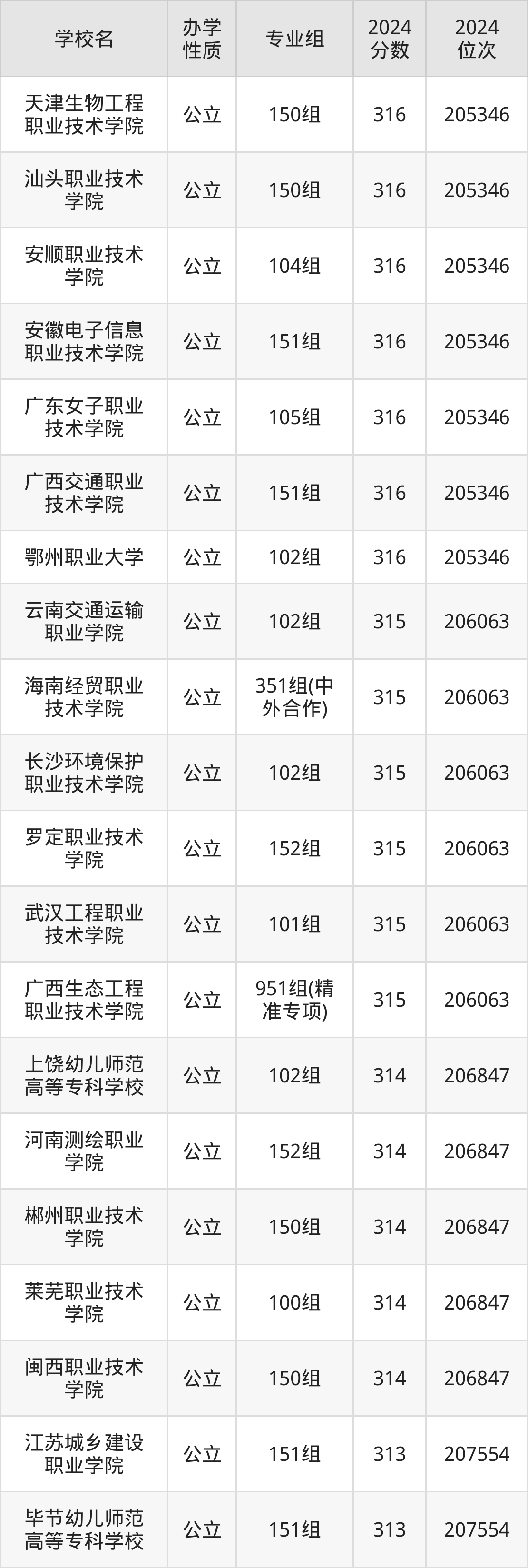 | 广西生态工程 职业技术学院 | 951组(精 准专项) | 315 | 206063 |