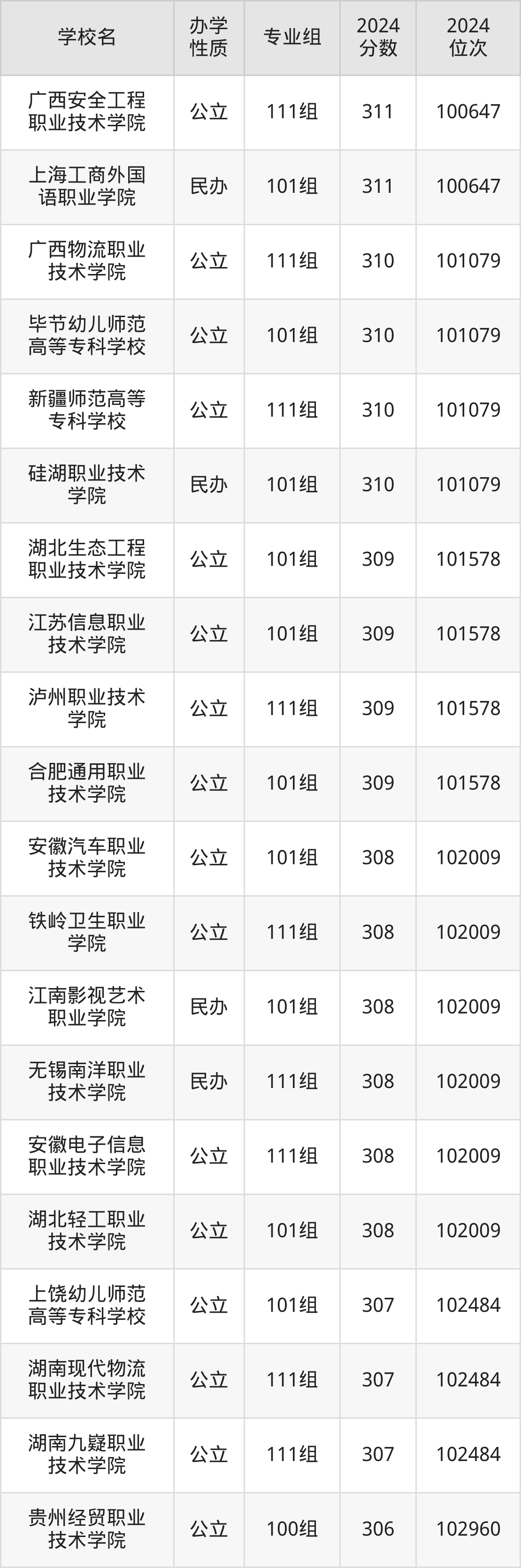| 合肥通用职业 技术学院 | 101组 | 309 | 101578 |