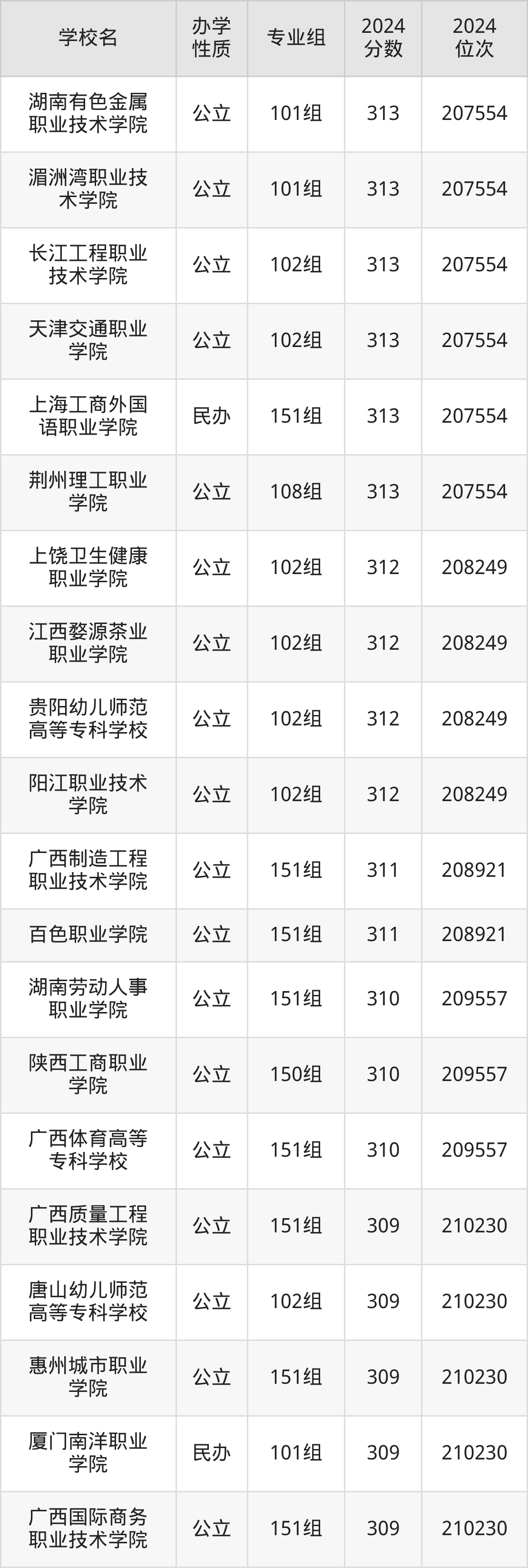 | 广西国际商务 职业技术学院 | 151组 | 309 | 210230 |