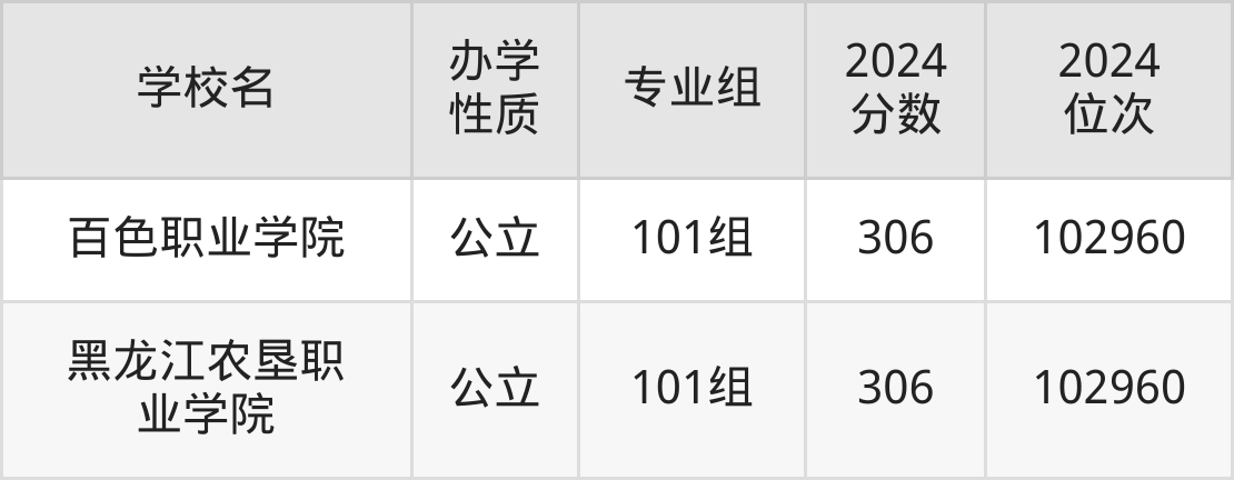 | 黑龙江农垦职 业学院 | 101组 | 306 | 102960 |