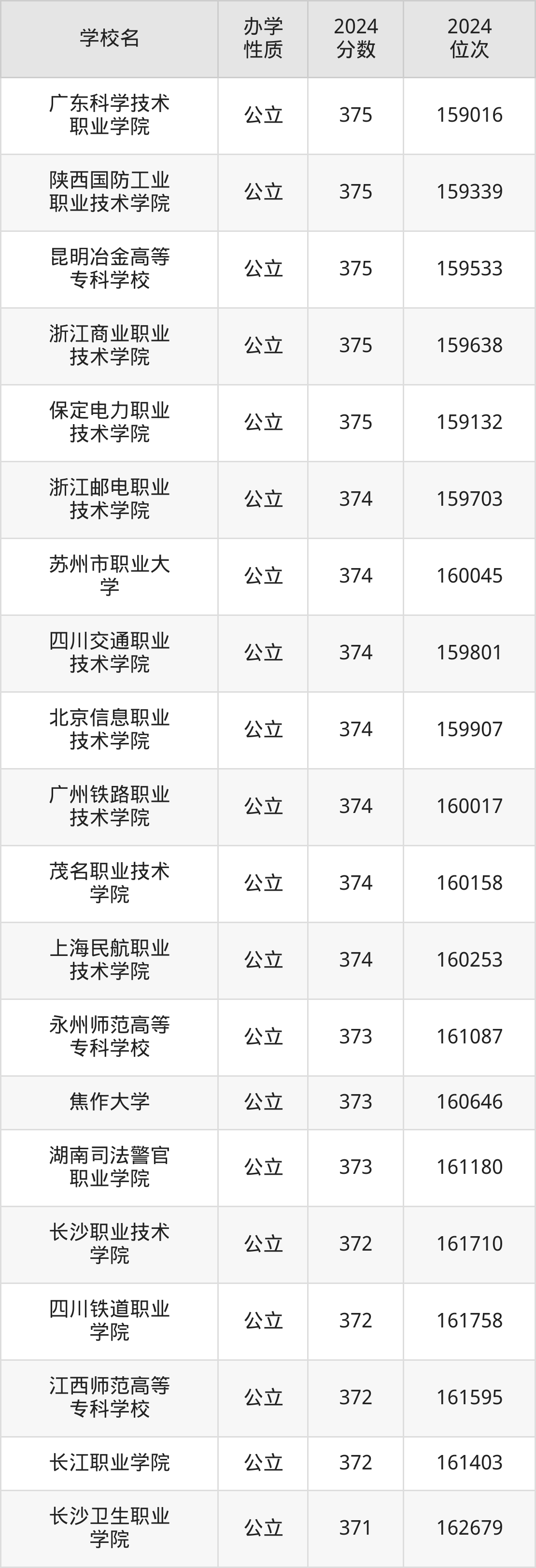 | 广州铁路职业 技术学院 | 374 | 160017 |