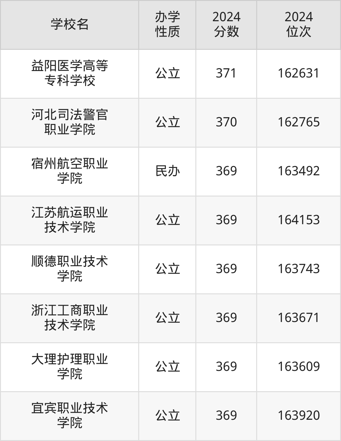 | 江苏航运职业 技术学院 | 369 | 164153 |