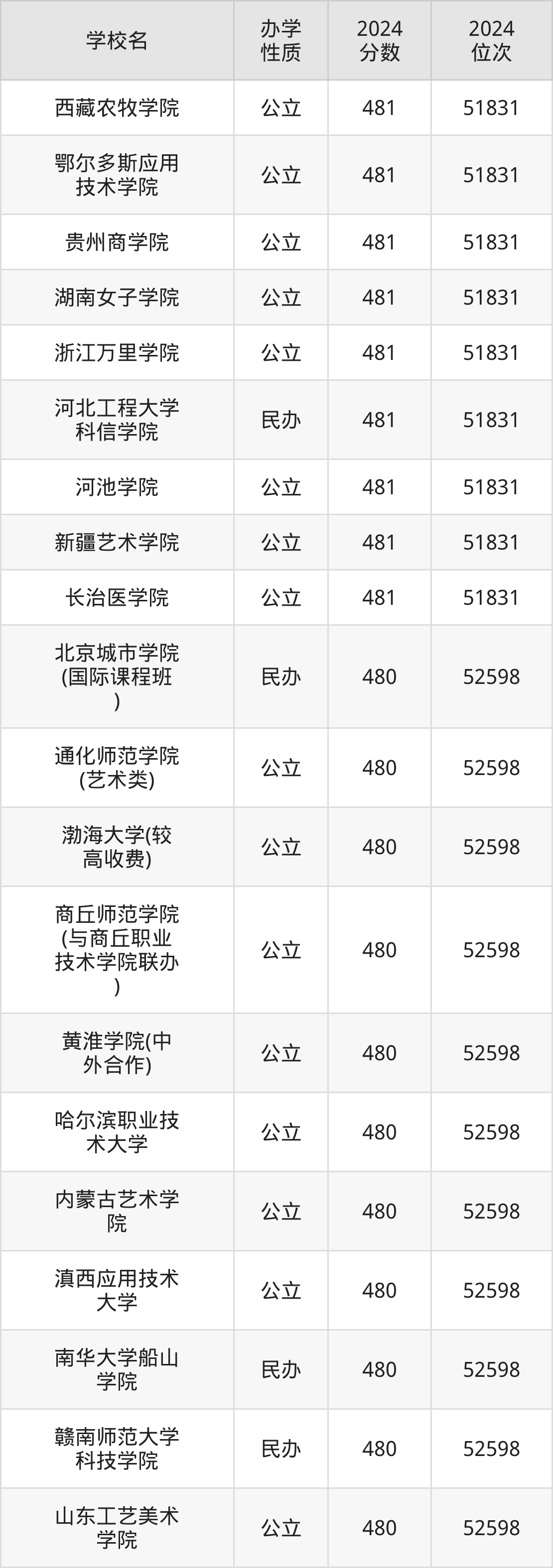 | 通化师范学院 (艺术类) | 480 | 52598 |