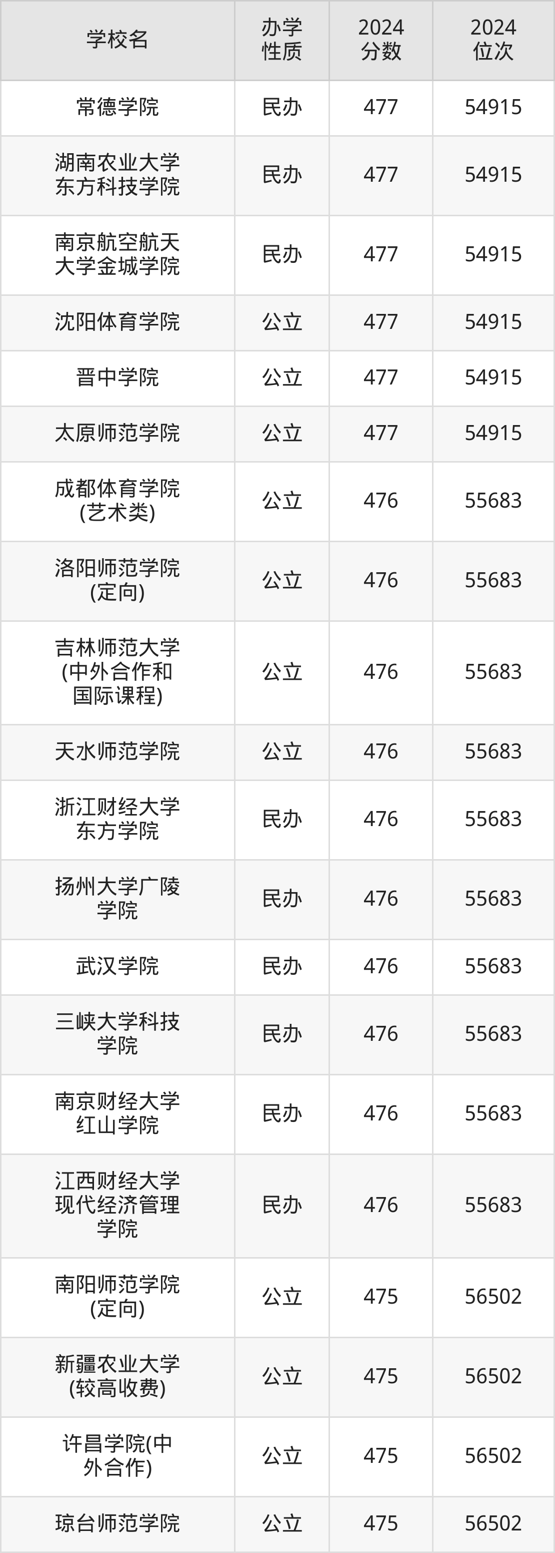 | 成都体育学院 (艺术类) | 476 | 55683 |