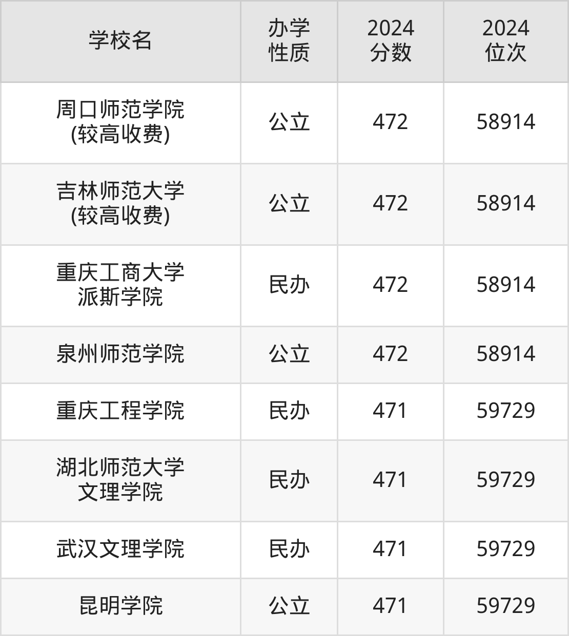 | 吉林师范大学 (较高收费) | 472 | 58914 |