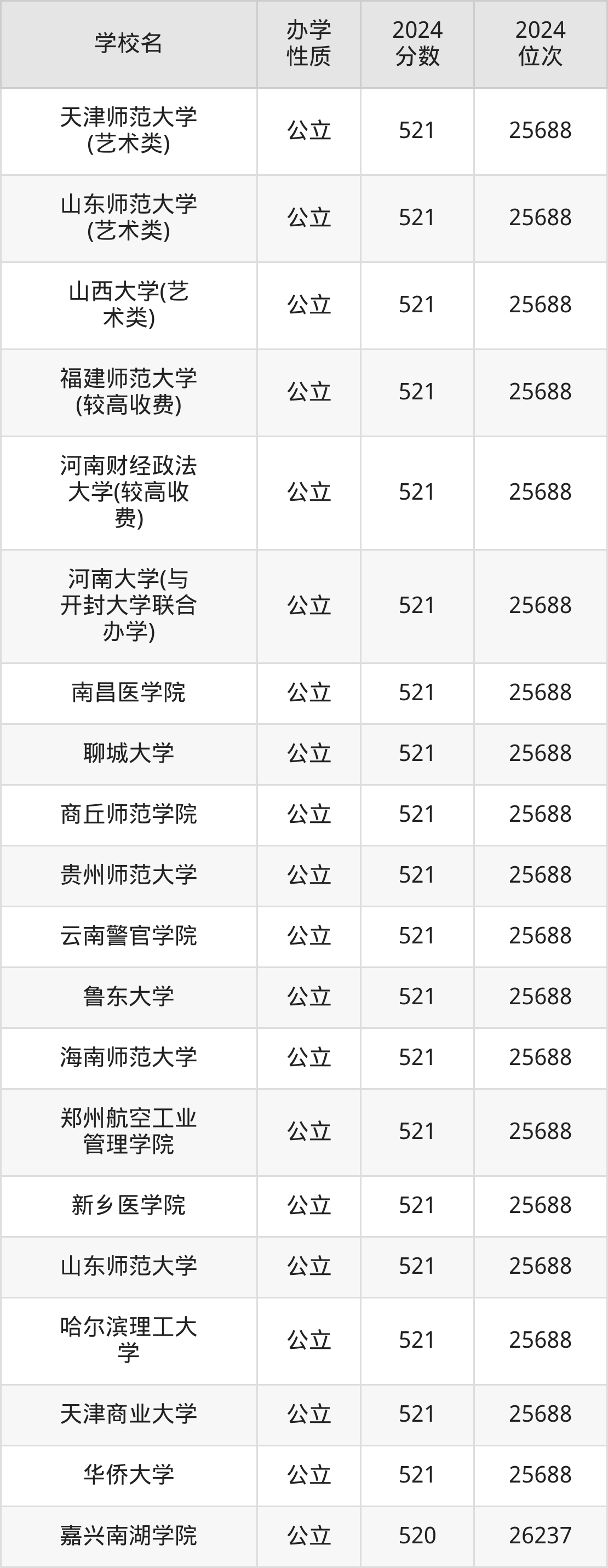 | 山东师范大学 (艺术类) | 521 | 25688 |