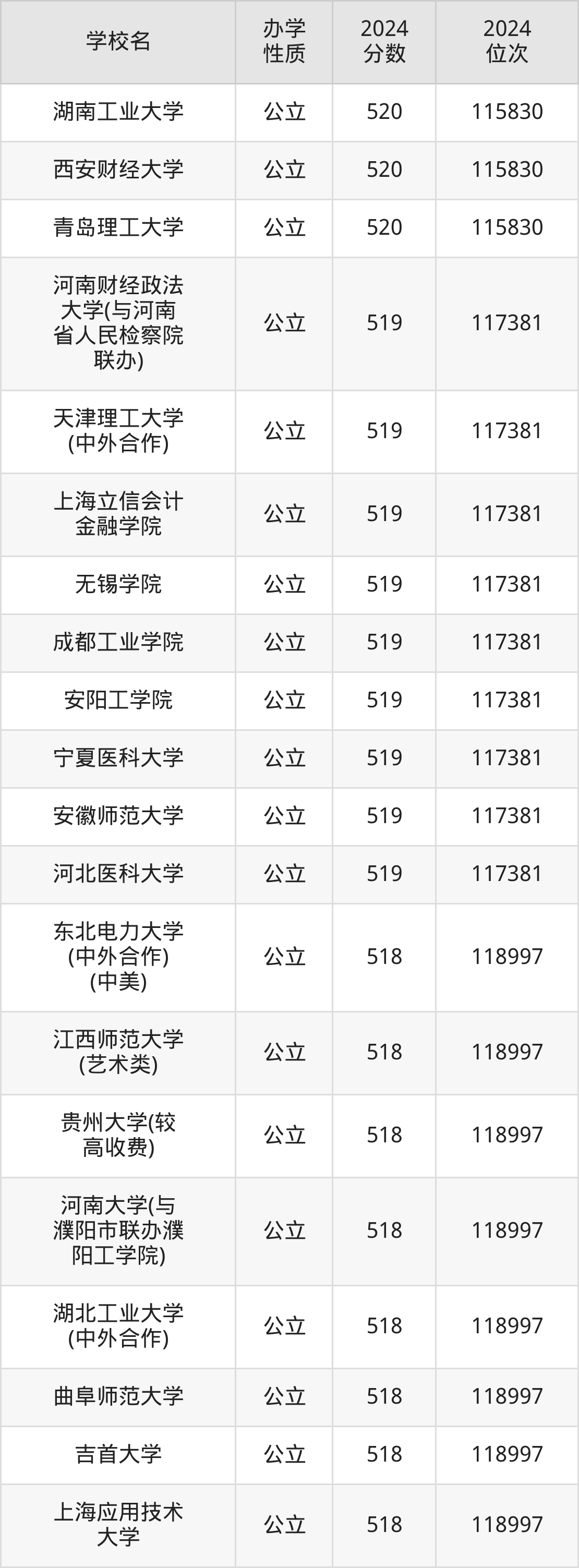 | 湖南工业大学 | 520 | 115830 |